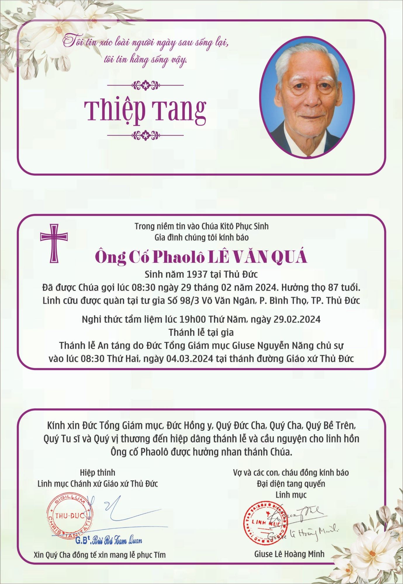 Cáo phó: Thân phụ linh mục Lê Hoàng Minh, chánh xứ Bình Đông, qua đời