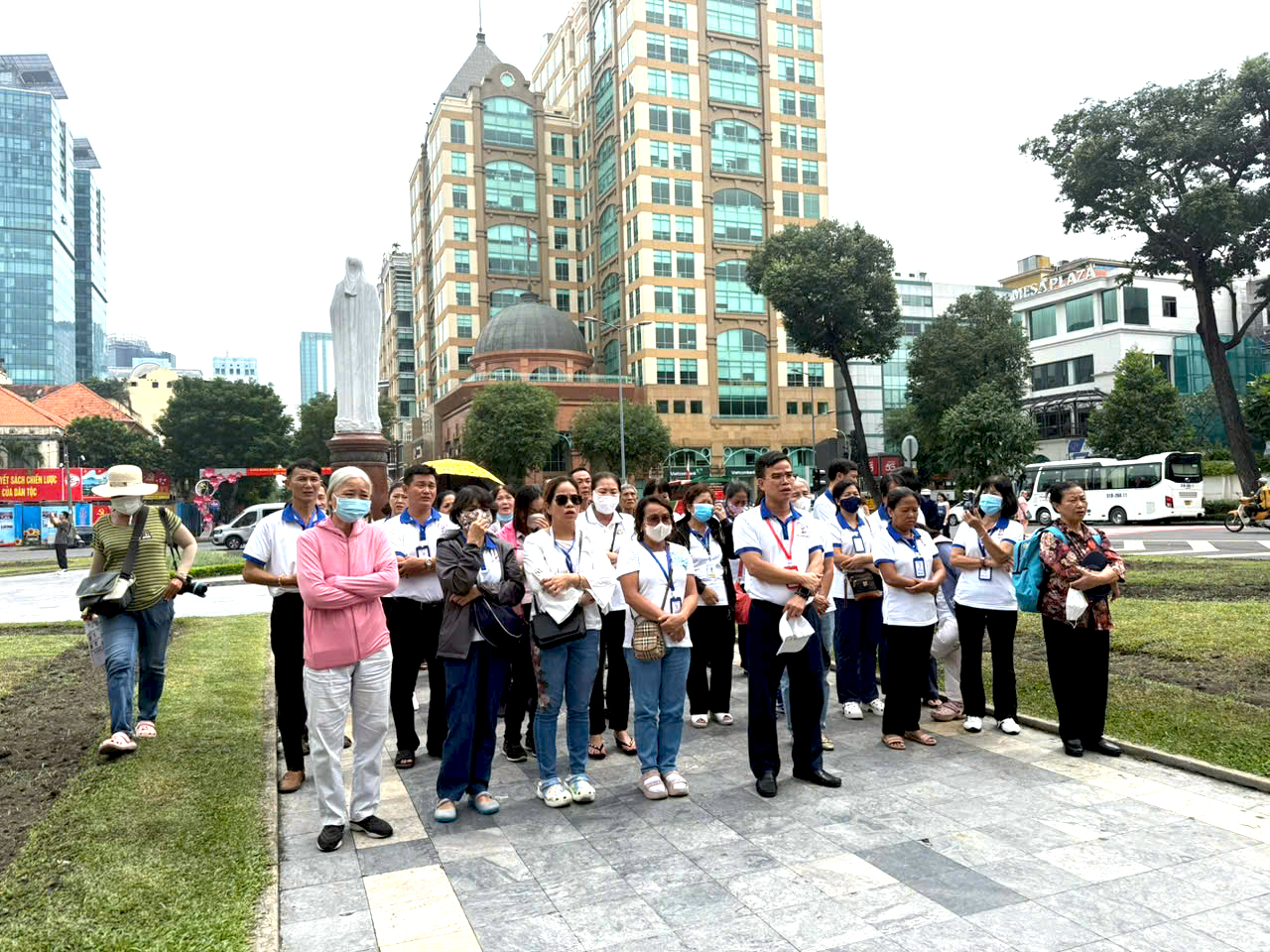 Trên đường đi, đoàn dừng chân tại Nhà thờ Đức Bà để viếng Đức Mẹ, dâng giờ kinh và xin Mẹ cầu bầu cho chuyến đi bình an.