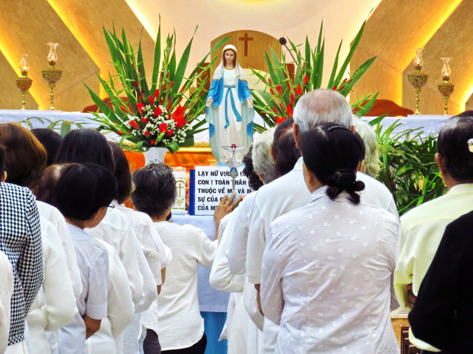 Từ 08g00, các hội viên Curia Gia Định 3 đã quy tụ tại nhà thờ để lần chuỗi Mân Côi. Kế đó, Linh mục Gioan Phạm Văn Thanh giúp cộng đoàn tìm hiểu thêm về ý nghĩa của việc dâng mình cho Đức Mẹ.