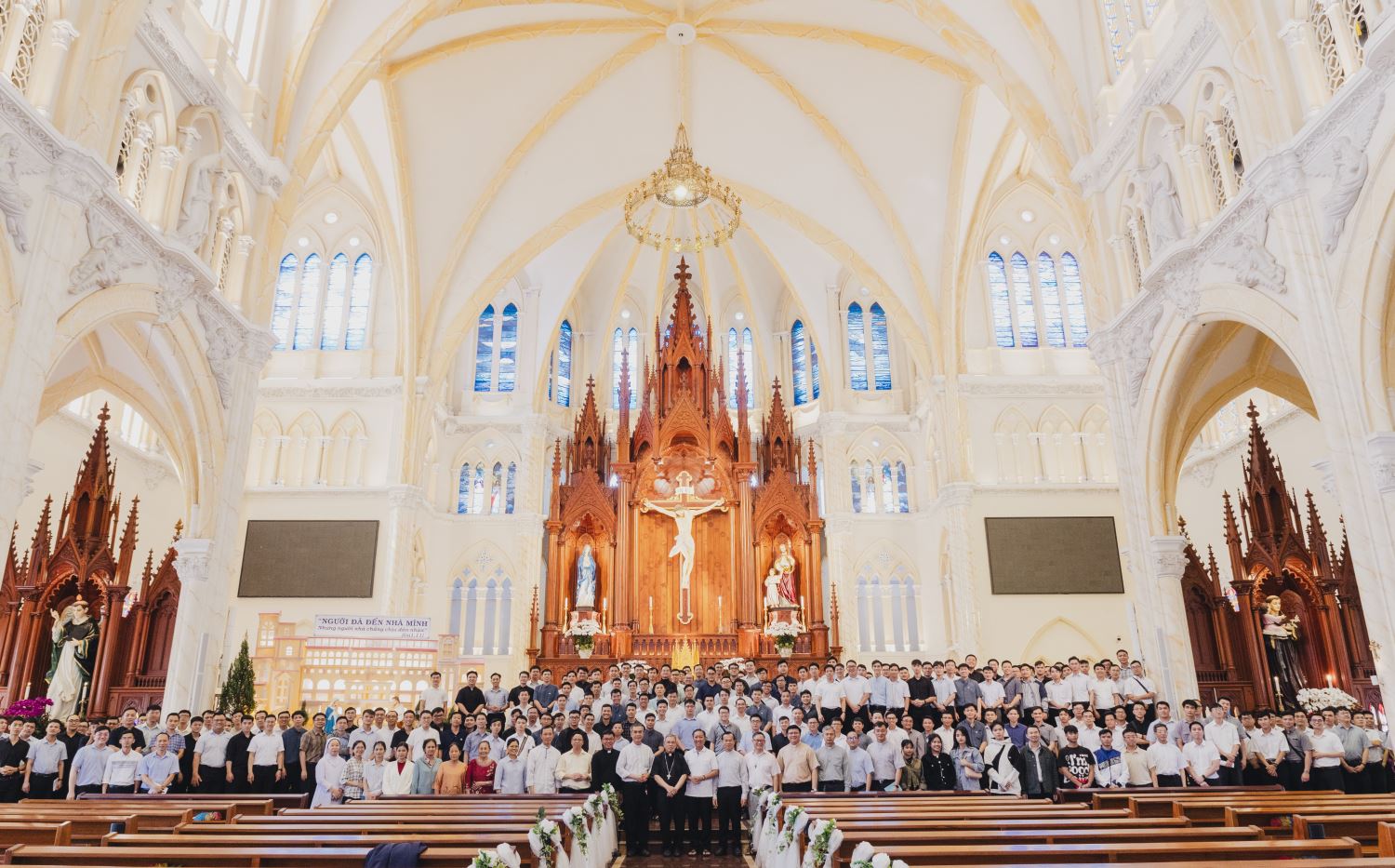 Điểm hành hương tiếp theo là Nhà thờ Song Vĩnh - một công trình mang kiến trúc Gothic độc đáo, không chỉ là điểm hành hương quan trọng của Giáo phận mà còn điểm tham quan nổi tiếng. Trải qua gần 10 năm xây dựng, ngôi thánh đường này đã trở thành một biểu tượng sống động cho đức tin kiên vững của người Kitô hữu nơi đây. Trong ngôi nhà thờ xinh đẹp này, gia đình Chủng viện cùng nhau đọc Kinh Trưa và Kinh Sách, đồng thời được cha xứ và Hội đồng Mục vụ giáo xứ đón tiếp cách thân tình, và cùng chia sẻ bữa trưa huynh đệ trong bầu khí thân hữu.