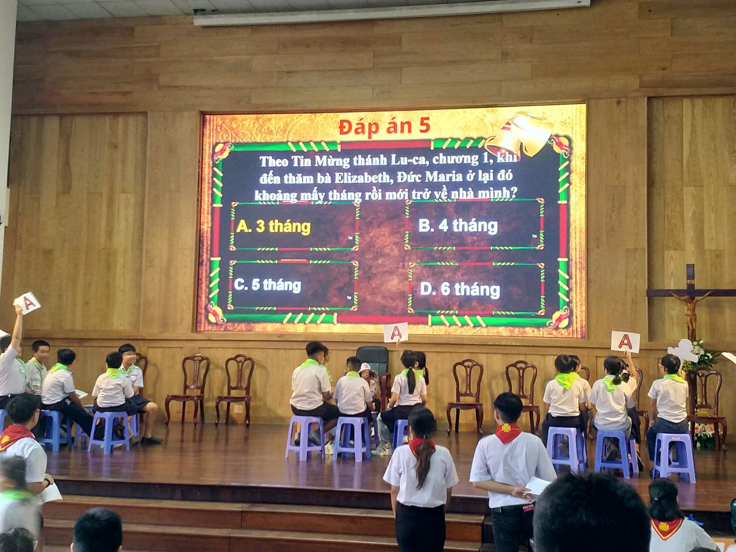 Sau bữa ăn trưa, các em được nghỉ giải lao một giờ. Đúng 14g, tất cả tề tựu tại hội trường lớn chia thành ba cụm theo ba hàng ghế tham dự cuộc thi Đố vui về giáo lý. Sau đó, các em hào hứng hòa mình vào các tiết mục văn nghệ do các thiếu nhi và huynh trưởng các giáo xứ trình diễn. Cuối chương trình, các em được lãnh quà Đố vui theo từng cụm.
