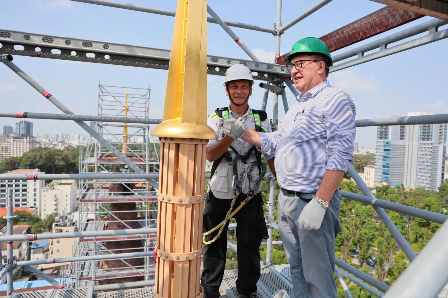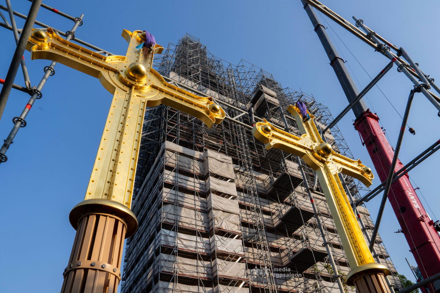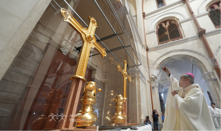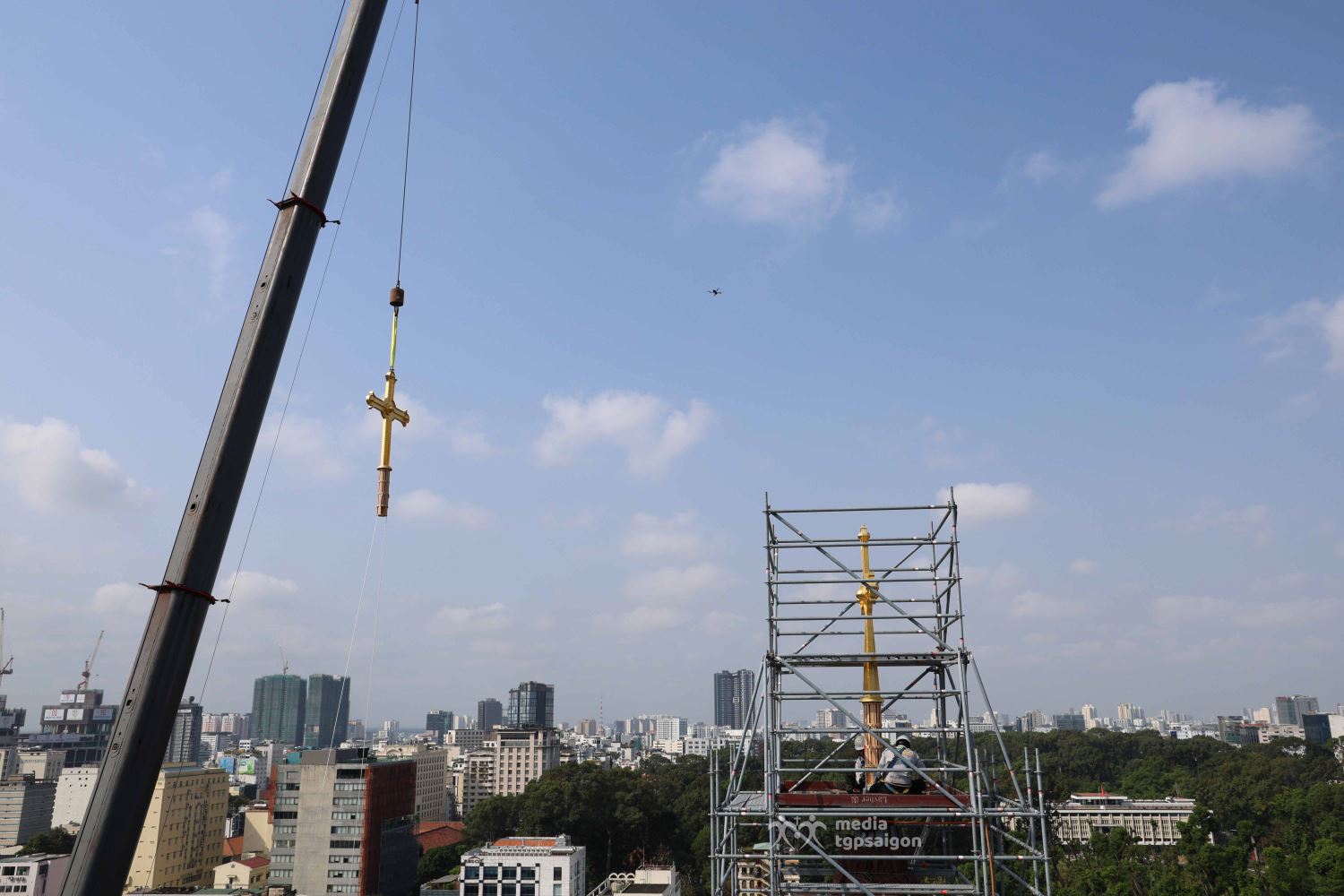Đúng 8 giờ sáng ngày 19-3-2026, lễ trọng kính thánh Giuse, hai Thánh giá mới được dát vàng bắt đầu được đưa lên đỉnh hai tháp kẽm của Nhà thờ Chính tòa Đức Bà Sài Gòn. Đây là một trong những hạng mục quan trọng thuộc dự án đại trùng tu đang được triển khai từ năm 2017.