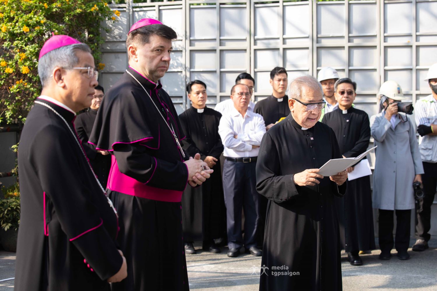 Trước khi hai Thánh giá được đưa lên đỉnh tháp kẽm Nhà thờ Chính tòa Đức Bà Sài Gòn, Đức Tổng Giám mục Marek Zalewski đã có bài diễn từ.