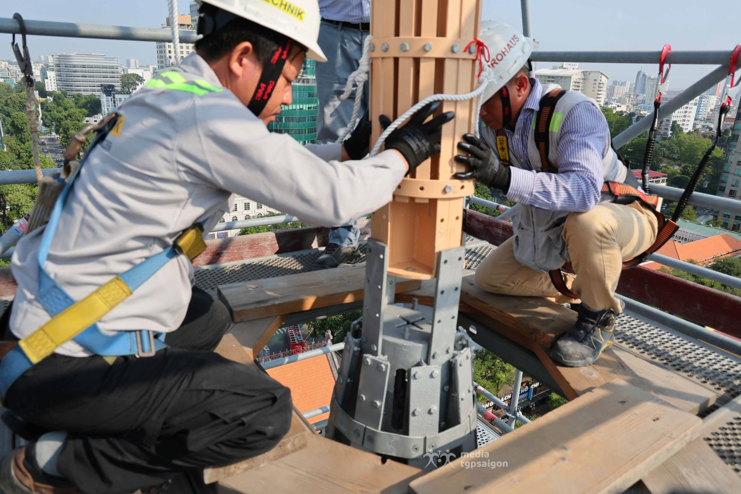 Đặt hai Thánh giá lên đỉnh tháp kẽm Nhà thờ Chính tòa Đức Bà Sài Gòn (19-3-2026)