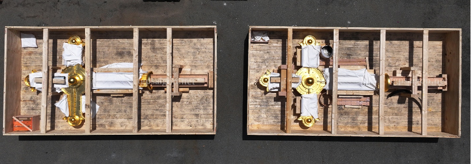 Sau khi hoàn tất, hai Thánh giá được vận chuyển bằng đường thủy trong khoảng năm tuần. Ngày 08-12-2025, Đức Tổng Giám mục Giuse Nguyễn Năng đã cử hành nghi thức làm phép hai Thánh giá trong dịp lễ Đức Maria Vô nhiễm Nguyên tội. Sau đó, hai Thánh giá được đặt tại cửa chính nhà thờ để tín hữu và khách tham quan chiêm ngắm trước khi lắp đặt.