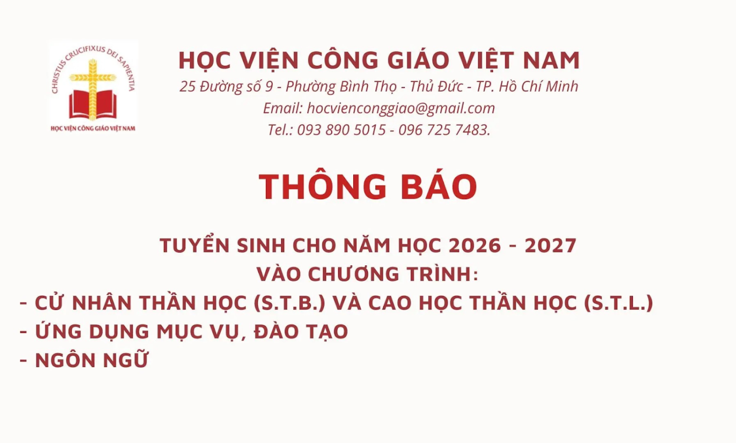 16. WHĐ (29/12/2025) – Sau đây là các thông báo của Học viên Công giáo Việt Nam về các chương trình tuyển sinh cho các khóa thần học, mục vụ và ngôn ngữ năm 2026. (xem thêm)