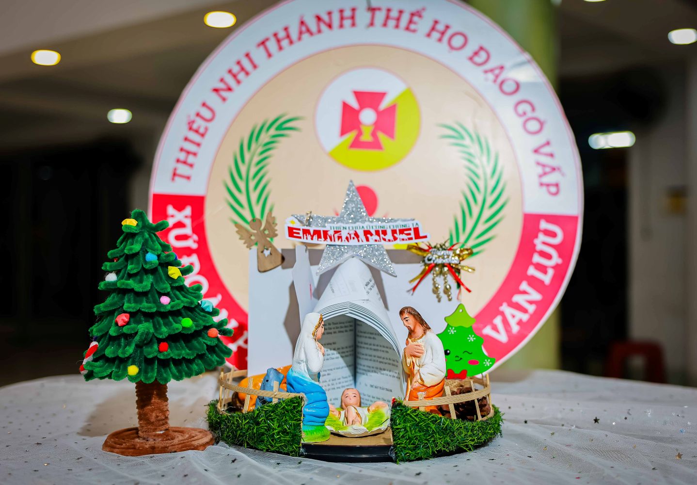 Từ những mảnh vật liệu giản đơn nhất - vải vụn, sách cũ, bạt thừa, vỏ cây khô, chai nhựa, ống hút nhựa bỏ đi,...với những bàn tay nhỏ bé của các em thiếu nhi và những trái tim rộng mở của anh chị Huynh trưởng - Giáo lý viên (HT-GLV) của Xứ đoàn Phêrô Nguyễn Văn Lựu đã tỉ mỉ, chăm chút, biến chúng thành những hang đá Bêlem lung linh, nhỏ nhắn mà ấm áp lạ thường. Mỗi hang đá không chỉ là một món quà thủ công, mà là một lời thì thầm yêu thương, một hơi ấm của tình Chúa được gửi gắm qua từng chi tiết nhỏ.