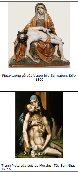 Phải chăng vì Pietà diễn tả sự đau xót và thương xót? Gần như hầu hết các tác phẩm Pietà trước đó và sau đó đều nhấn mạnh đến khía cạnh này của chủ đề. Nhiều khi là quá thống thiết, bi thương! (xem ảnh minh họa ở dưới)