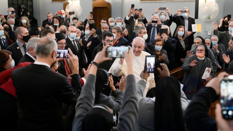 Sau khi được chào đón chính thức tại sân bay quốc tế Larnaca, vào lúc 16 giờ thứ Năm 02/12/2021, Đức Thánh Cha đến Nhà thờ chính toà Maronite Đức Mẹ Ban Ơn ở Nicosia, để gặp các linh mục, tu sĩ nam nữ, phó tế, giáo lý viên, các hiệp hội và phong trào của Giáo hội Sýp.