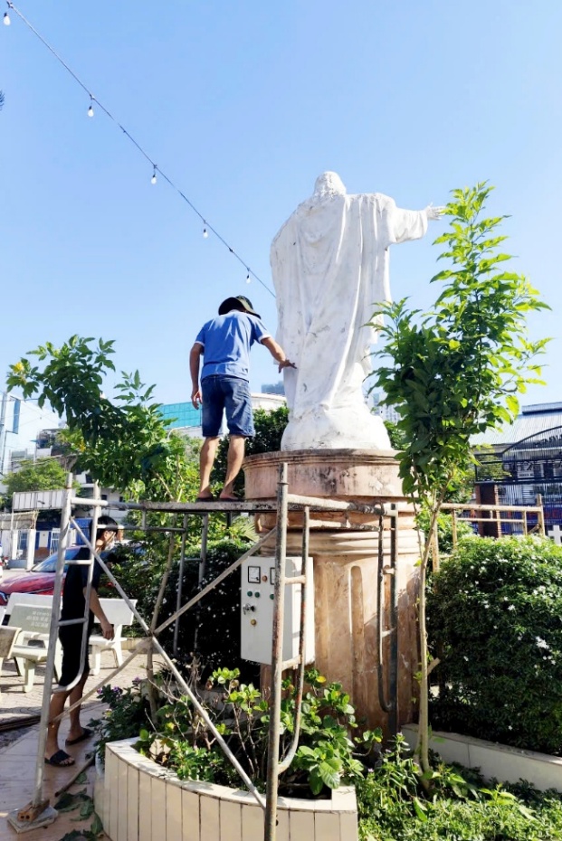 Trong khi bên trong nhà thờ, mọi người đang tất bật với việc chuẩn bị hang đá, diễn tập cho đêm Vọng Giáng Sinh, thì bên ngoài, nhóm bạn trẻ vẫn lặng lẽ với công việc của mình. Không khí Giáng Sinh ùa về nhà thờ không chỉ bằng tiếng nhạc Noel du dương vang vọng, mà còn bằng mùi sơn mới đang dần hoàn thiện trên dung nhan Đức Mẹ.