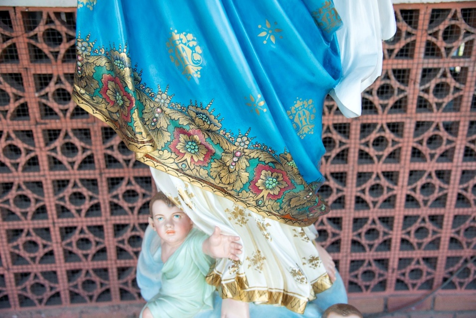 Trải qua rất nhiều năm được đặt cố định trên ban công trước tiền sảnh nhà thờ, tượng Đức Mẹ đã phai dần theo thời gian. Những lớp sơn phủ trước đây, đã làm khuất lấp những chi tiết nguyên bản của pho tượng. Và cũng rất may mắn, chính các lớp sơn phủ này đã bảo vệ nguyên vẹn các họa tiết nguyên bản của pho tượng cổ. Các em đã giúp đại diện Ban Mục vụ Truyền thông giáo xứ leo lên dàn giáo, chui qua một lỗ thông gió bước ra ban-công cao, nơi đặt tượng Đức Mẹ mà nhiều năm hiếm có ai chạm đến, để xác định xuất xứ, nguồn gốc và đánh giá hiện trạng.