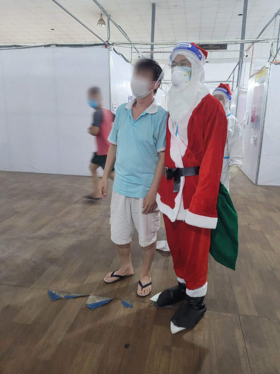 Nhìn nụ cười tỏa rạng trên đôi môi của các bệnh nhân, ánh mắt lấp lánh nơi những em nhỏ, và những cái chạm tay đầy yêu thương với mọi người, chúng tôi dường như đã được đụng chạm đến Hài Nhi Giêsu nơi các bệnh nhân F0. Họ rất vui và hạnh phúc khi được nghe những giai điệu rộn ràng của bài hát Jinger Bell, được nghe những lời động viên, an ủi nhộn nhịp của các thiện nguyện viên, được bắt tay và chụp hình với ông già Noel đáng yêu… tất cả như một làn sóng yêu thương lan tỏa đến mọi người.
