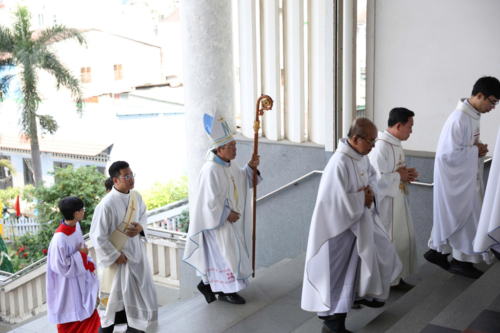 Mở đầu Thánh lễ, Đức Giám mục Phụ tá Giuse thay mặt Đức Tổng chuyển lời cám ơn đến tất cả các linh mục, tu sĩ nam nữ, đại diện các đoàn thể, đặc biệt là thành viên Hội đồng Mục vụ trong hạt Thủ Thiêm đã cộng tác cùng Tổng Giáo phận trong Phụng vụ Giáo hội.
