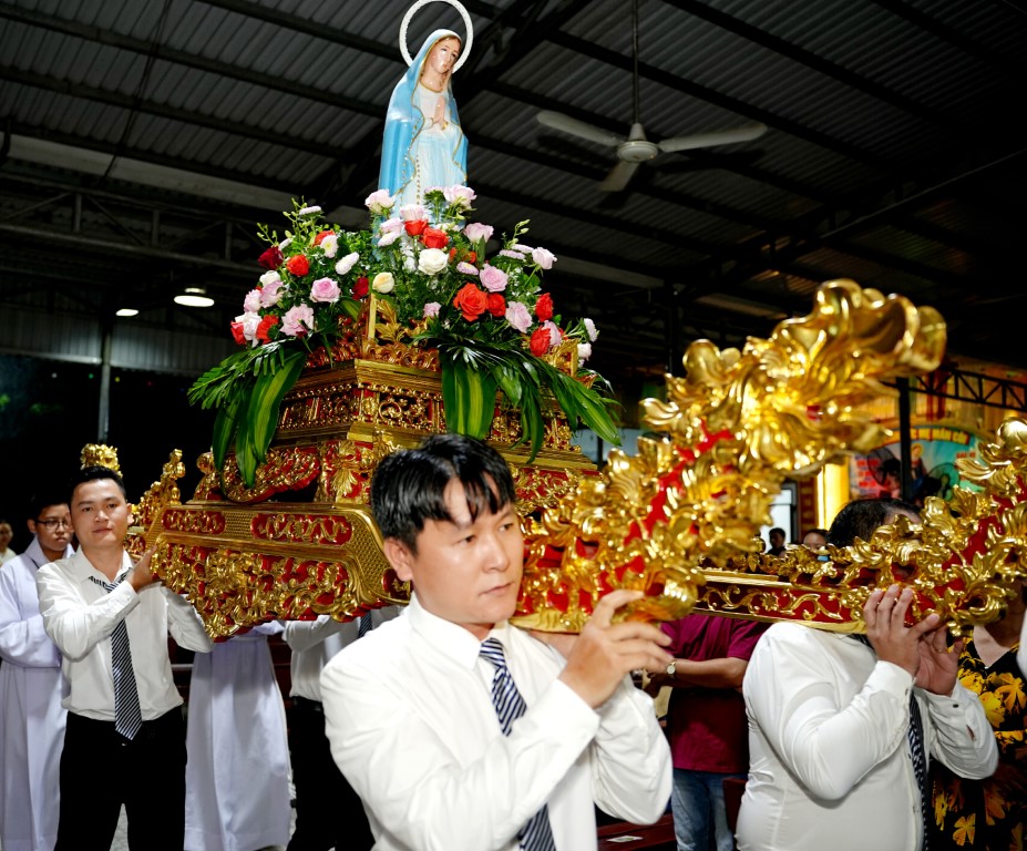 Trong tiếng trống vang dội, cộng đoàn rước kiệu Đức Mẹ tiến vào thánh đường. Mọi người vừa đi vừa suy ngẫm và cầu nguyện để tỏ lòng tôn kính và mến yêu Đức Mẹ.