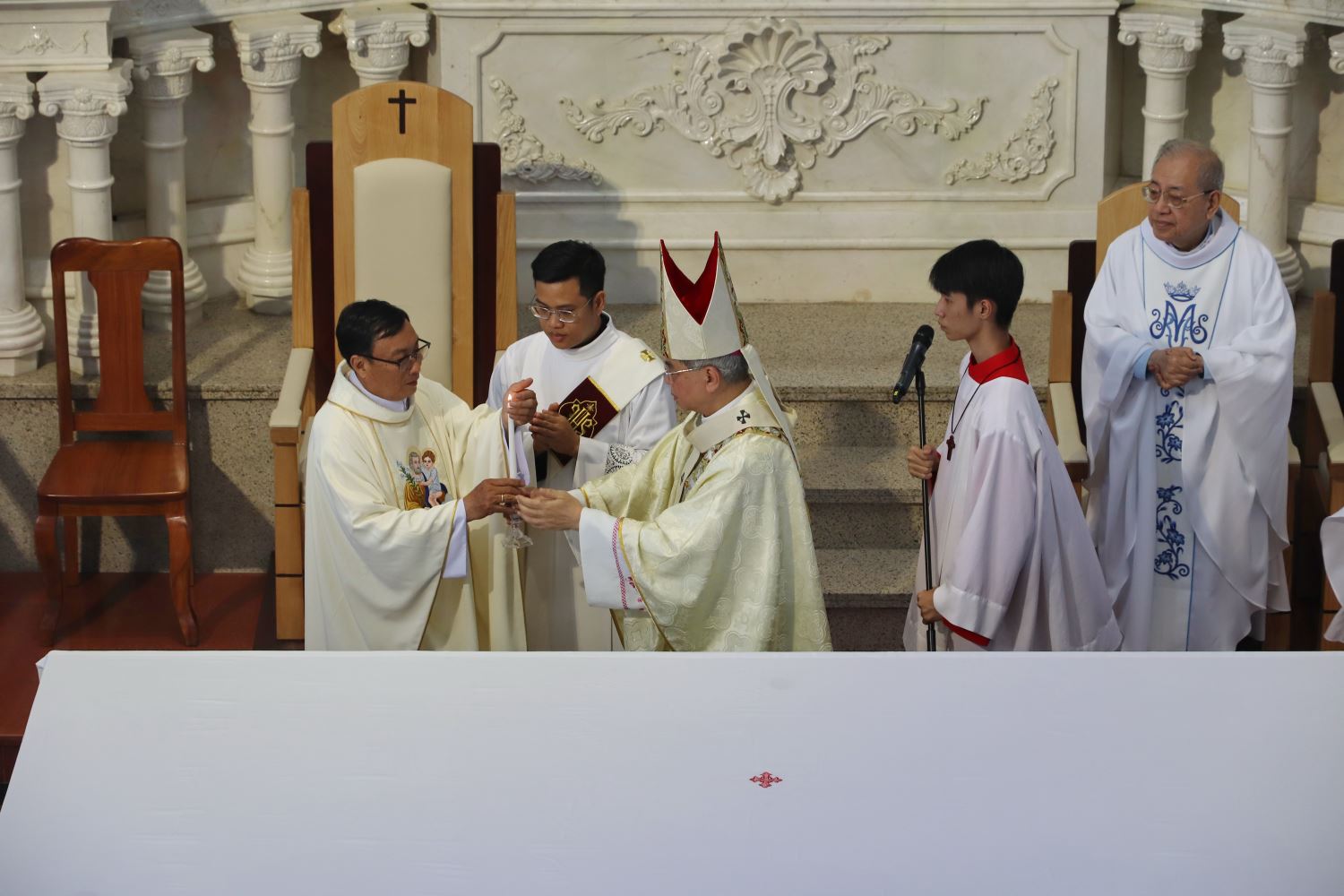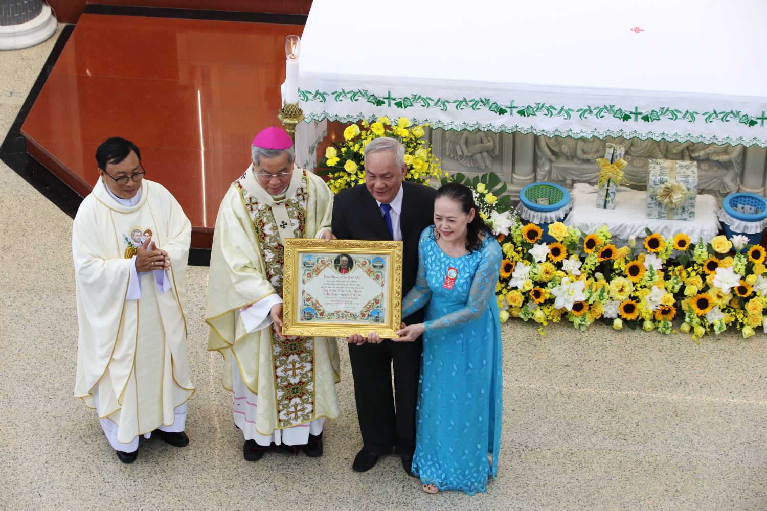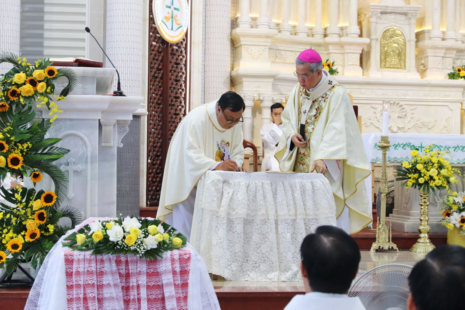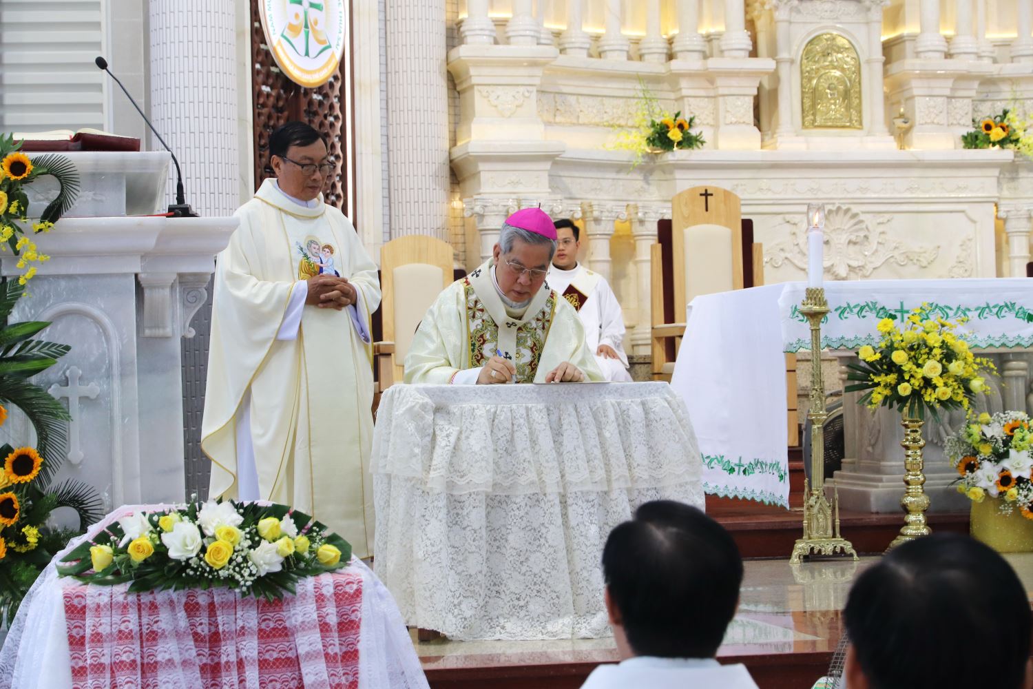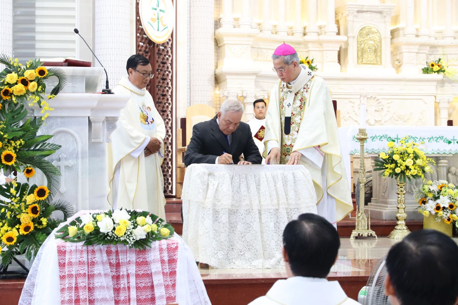 Tiếp đó, linh mục Gioan Bùi Thái Sơn, Đại diện Tư pháp Tòa Tổng Giám mục, công bố chứng thư ghi nhận việc cung hiến nhà thờ và thánh hiến bàn thờ mới trước cộng đoàn.