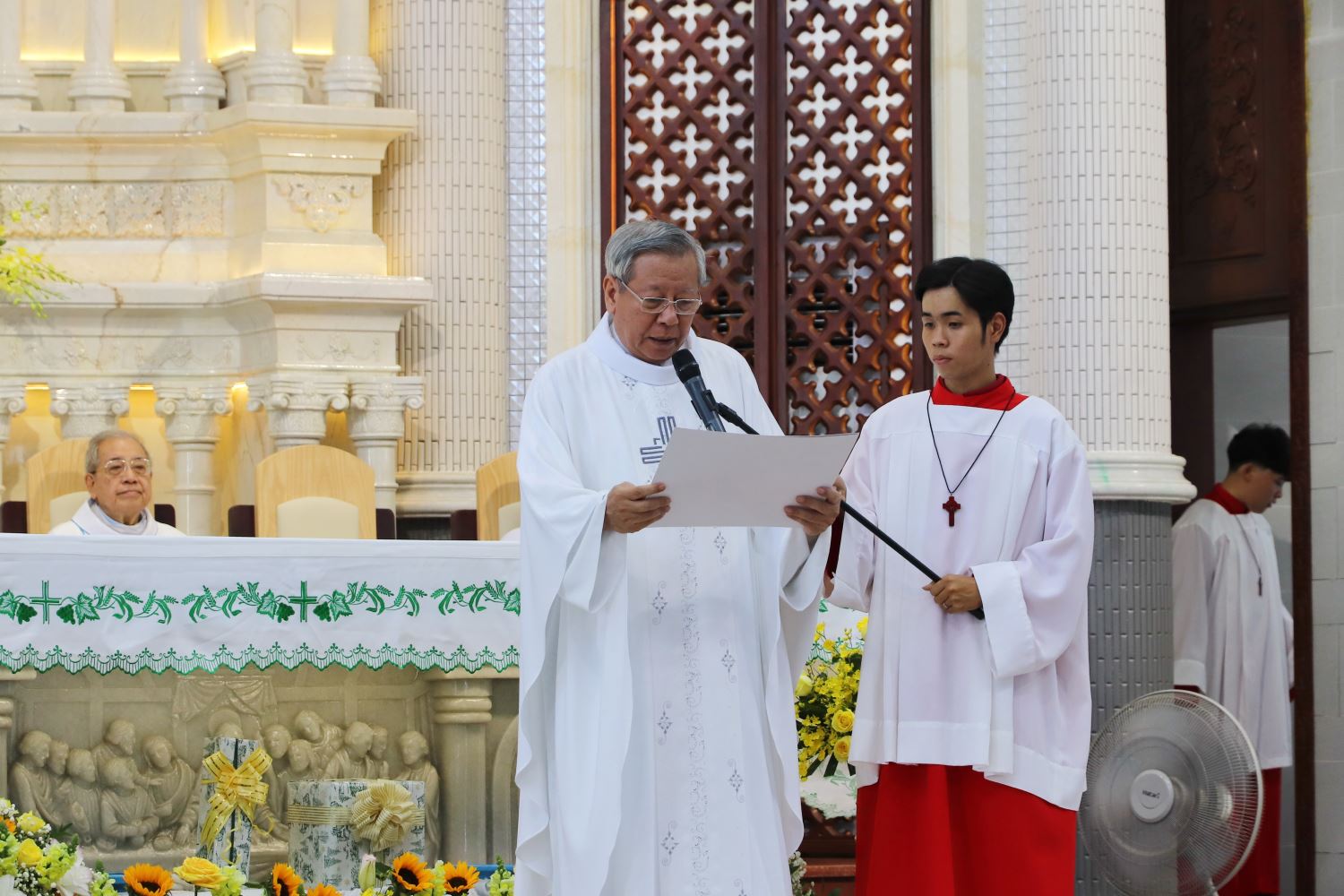 Đồng tế với ngài có linh mục Inhaxiô Hồ Văn Xuân - Tổng Đại diện, linh mục Đaminh Nguyễn Trung Kiên - Hạt trưởng Hạt Hóc Môn, linh mục chánh xứ Gioan Maria Vianney Chu Minh Tân, cùng hơn 60 linh mục trong và ngoài giáo hạt. Thầy phó tế phục vụ Bàn Thánh.