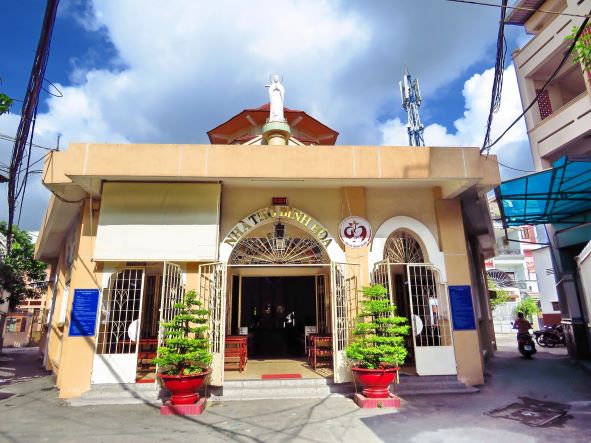 TGPSG -- Có một ngôi nhà thờ nhỏ nằm khiêm nhường giữa khu dân cư đông đúc, trong một con hẻm lớn trên đường Nơ Trang Long. Đó là Nhà thờ Bình Hòa, tọa lạc tại số 93/9 Nơ Trang Long, Phường 11, Quận Bình Thạnh. Điện thoại số: 38431861.