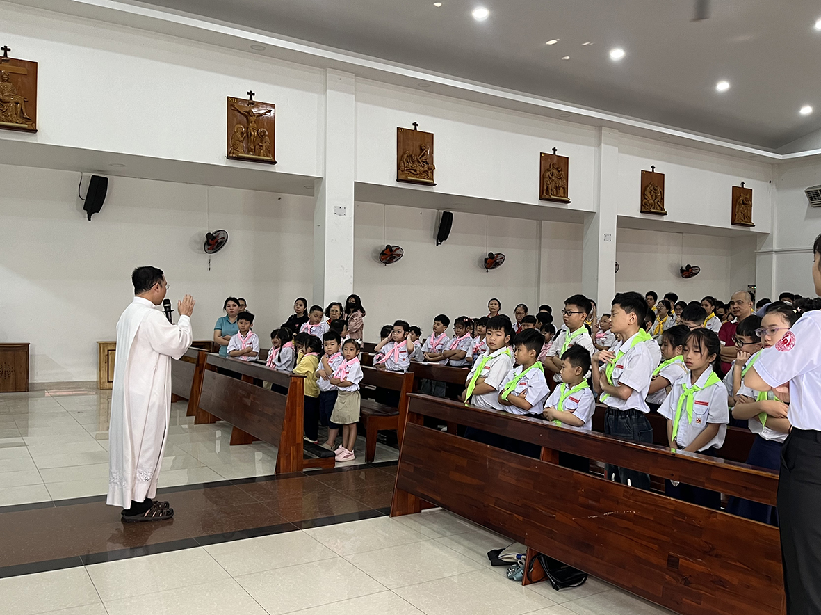 TGPSG -- Vào lúc 07g30 sáng Chúa nhật, ngày 08.02.2026, Thánh lễ Tạ ơn mừng đón Xuân Bính Ngọ 2026, với chủ đề “Vui cùng Chúa Xuân”, dành cho các em Thiếu nhi Thánh Thể (TNTT) và các anh chị Giáo lý viên, được cử hành tại nhà thờ giáo xứ Bình Minh, do linh mục Quản xứ Gioan Baotixita Lê Quốc Đạt chủ tế.