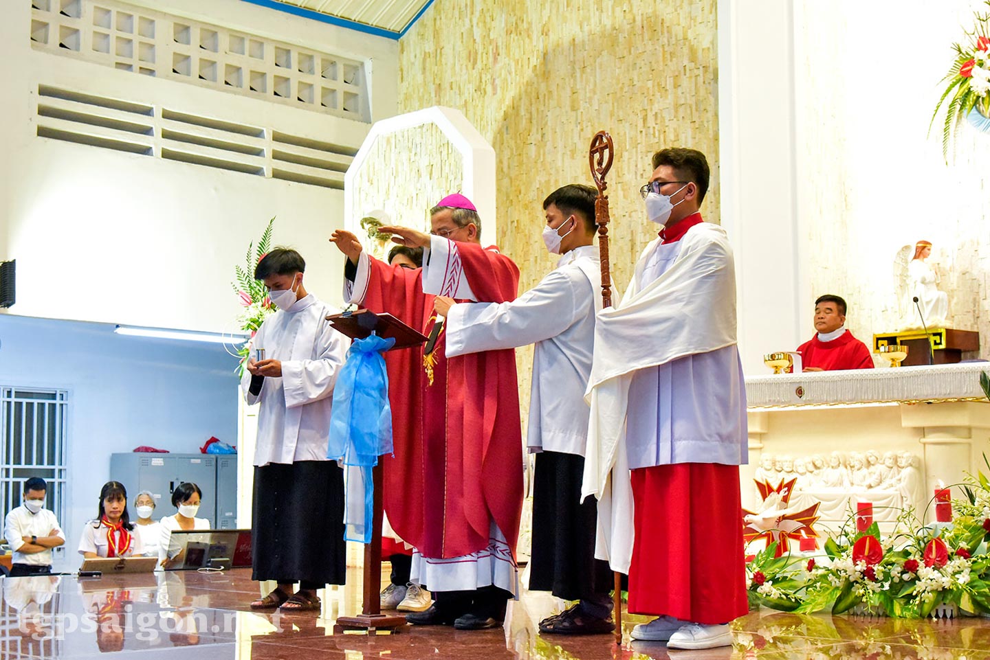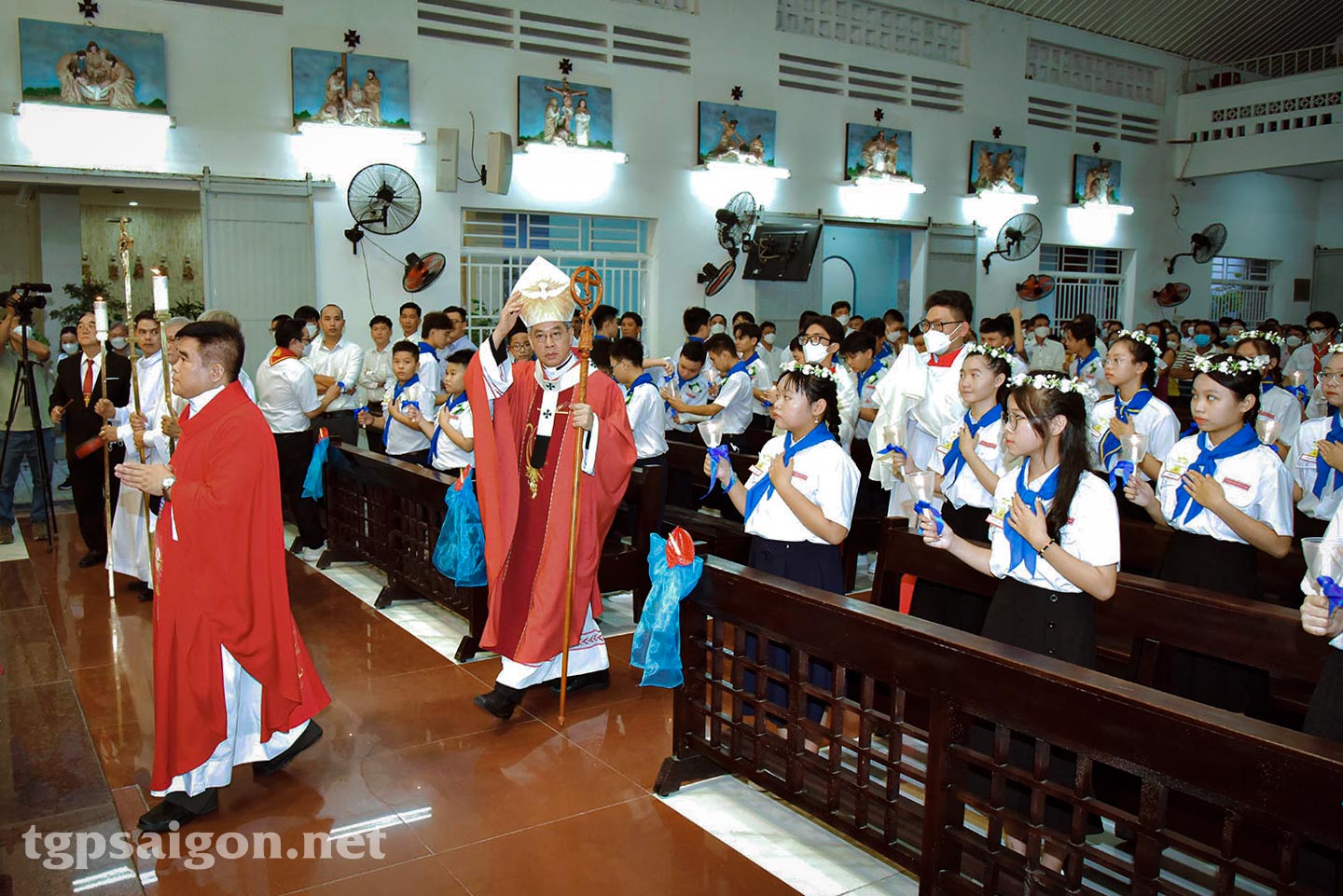 Thánh lễ trọng thể do Đức TGM Giuse chủ tế, cùng với Lm chánh xứ Gioan B. Đào Quốc Chung và quý linh mục đồng tế. Hiệp dâng thánh lễ có các em thiếu nhi lãnh nhận bí tích Thêm Sức, cha mẹ đỡ đầu, phụ huynh của các em và cộng đoàn giáo xứ ngồi chật kín trong và ngoài nhà thờ.