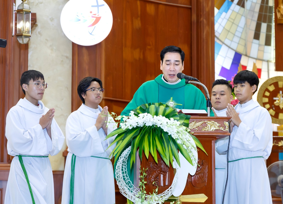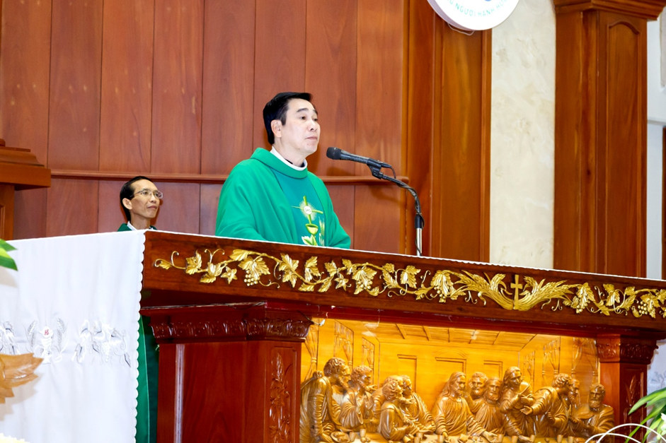 Chủ tế Thánh lễ là linh mục (Lm) Chánh xứ Giuse Lê Ngọc Đa, đồng tế với ngài là Lm phó xứ Phanxicô Assisi Đinh Hồng Phúc.