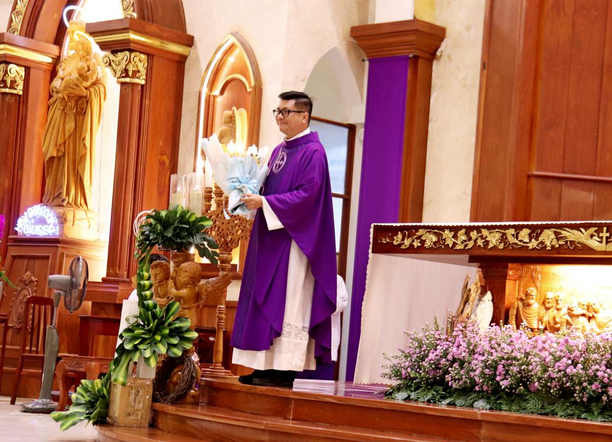 Trước khi kết thúc Thánh lễ, ông Chủ tịch Hội đồng Mục vụ giáo xứ thay mặt cho các bạn trẻ gửi lời cảm ơn Linh mục Giuse Phạm Quốc Văn và trao tặng ngài bó hoa tươi thắm như dấu chỉ tri ân.