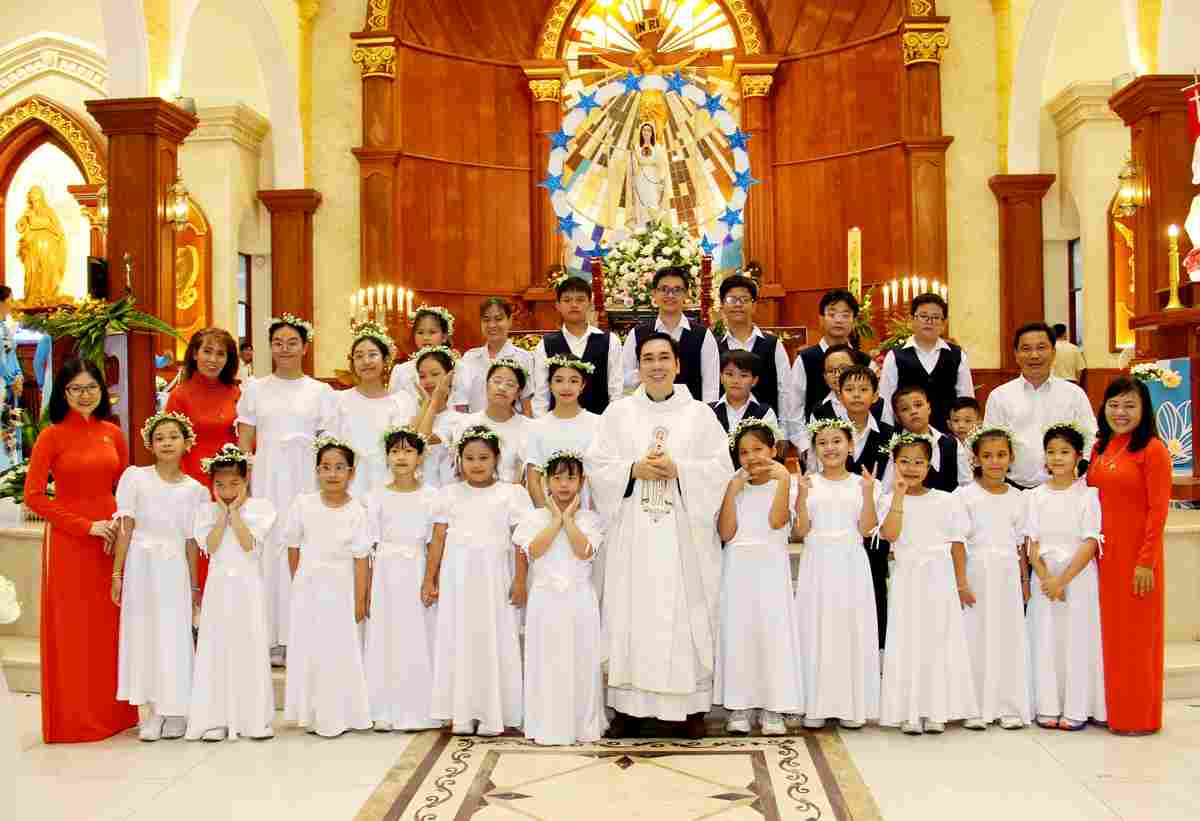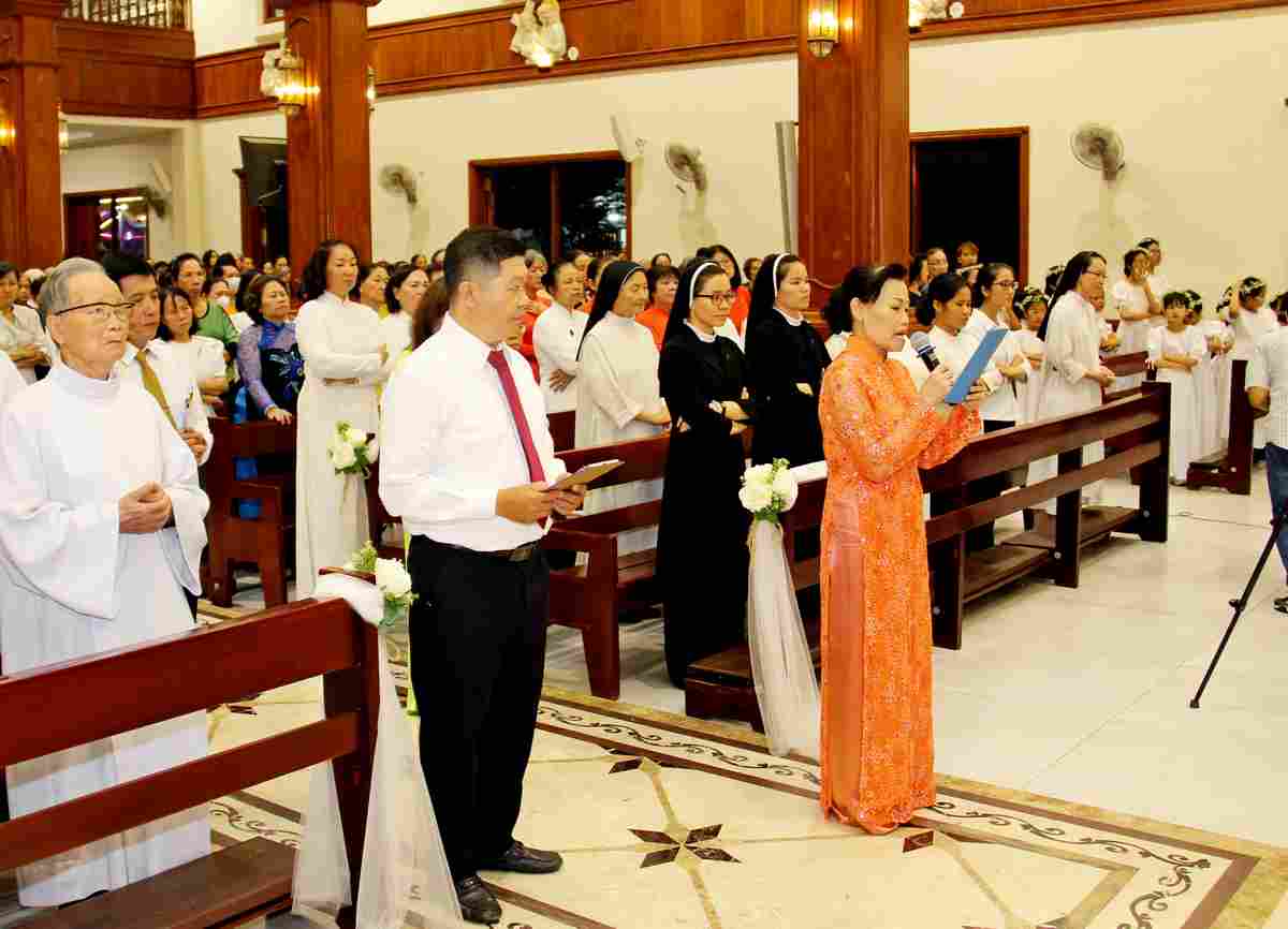 Tiếp theo là phần tiến hoa do Hội Các Bà Mẹ Công giáo cùng với các em Thiếu nhi thực hiện.