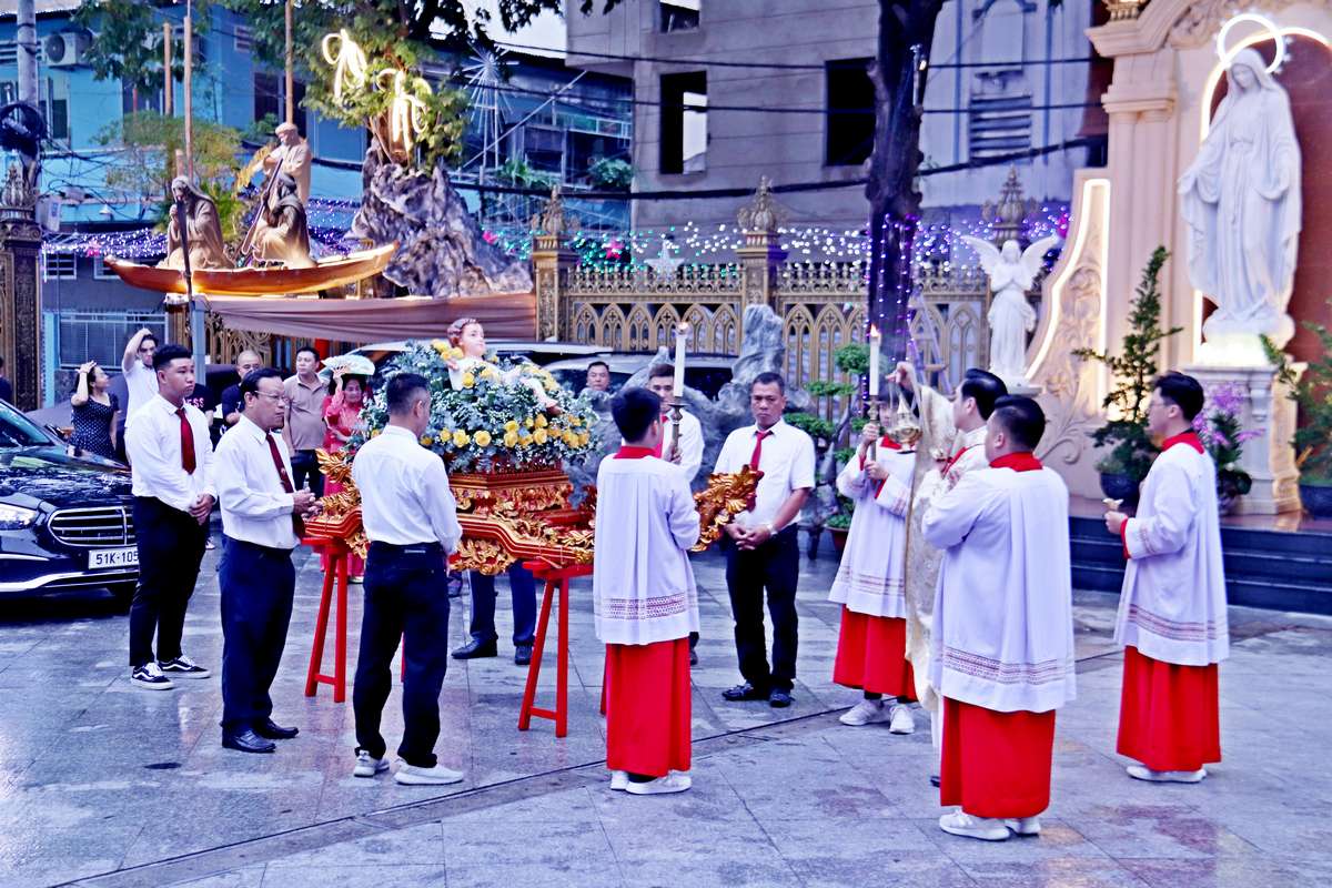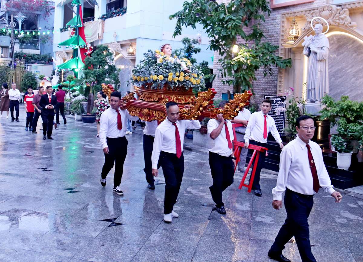 Thánh lễ khởi sự với đoàn rước cung nghinh Chúa Hài đồng chung quanh thánh đường tiến vào nhà thờ.