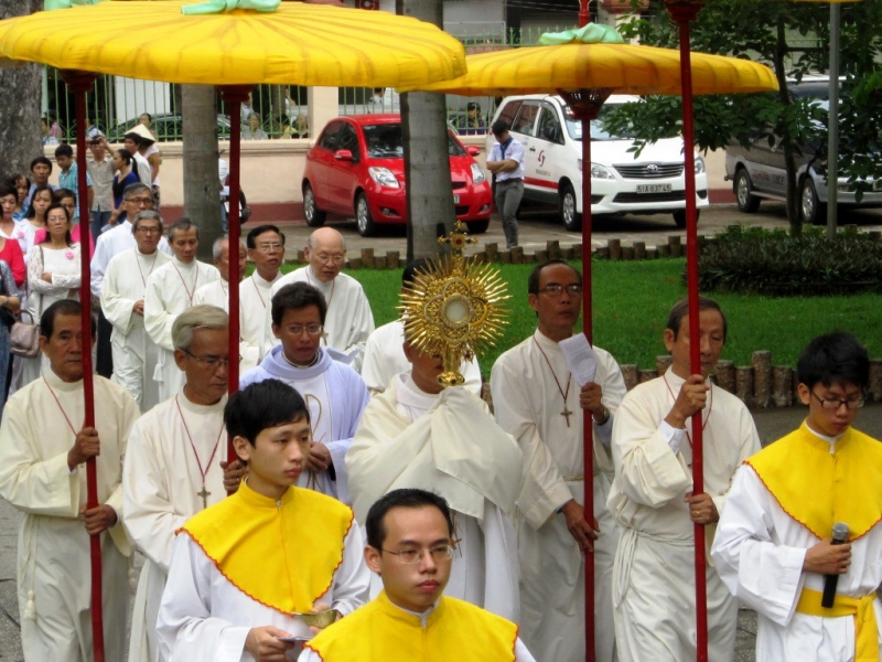 WGPSG -- Sáng Chúa nhật 22 tháng 6 năm 2014, lễ kính Mình Máu Thánh Chúa Kitô đã được cử hành trọng thể tại nhà thờ Chợ Quán. Buổi lễ gồm 3 phần: kiệu Thánh Thể, Rước Lễ lần đầu, Tổng kết niên học giáo lý 2013- 2014.