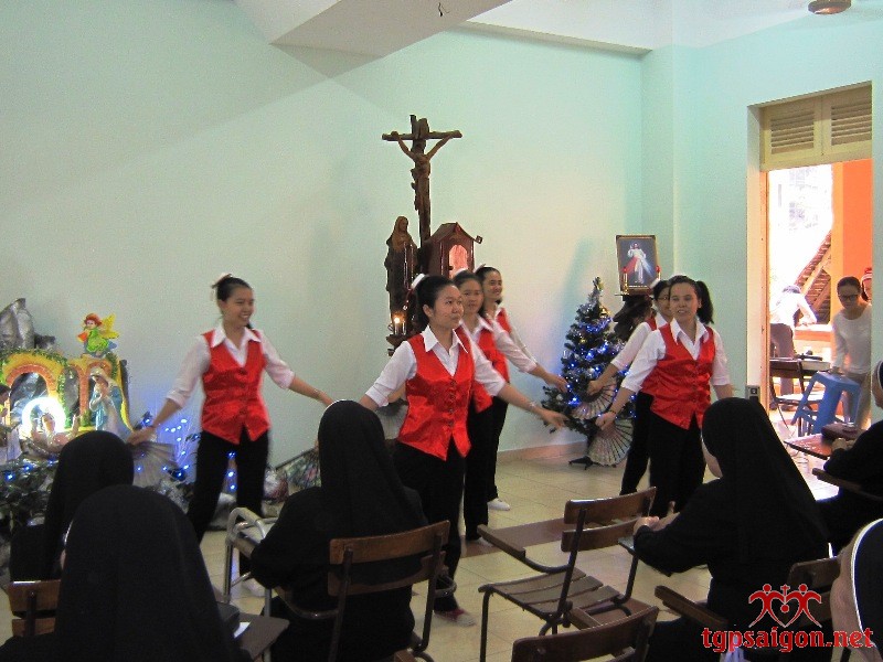 Trong hội trường, tay bắt mặt mừng, các soeur dù tuổi cao nhưng vẫn còn minh mẫn, luôn miệng tươi cười, hỏi thăm các gương mặt quen thuộc vẫn thường đến với các soeur. Soeur phụ trách nhà hưu đã chào mừng và cảm ơn quý hội đoàn. Chương trình văn nghệ bỏ túi với các tiết mục hợp ca quen thuộc như bài “Đinh Đoong”, “Tiếng Chuông Giáng Sinh” được các chị chuẩn bị tập tành cẩn thận, nay hát lên tặng các soeur trong niềm xúc động bồi hồi. Đặc biệt, tiết mục vọng cổ “Đêm Bừng Sáng” do anh Chánh Tâm, đạo hữu Cao Đài tự sáng tác và biểu diễn thật ấn tượng. Xen kẽ các tiết mục của đoàn khách, các soeur cũng đã đáp lại bằng những tiết mục múa hát vui tươi và đầy ý nghĩa. Bài hát “Jingle Bell” và “Merry Christmas” của các hiền mẫu Chợ Quán thật sôi động kết thúc chương trình văn nghệ. Các chị mang những phần quà trong những chiếc túi đỏ thắm dâng tặng tận tay các soeur với lời thăm hỏi ân cần.