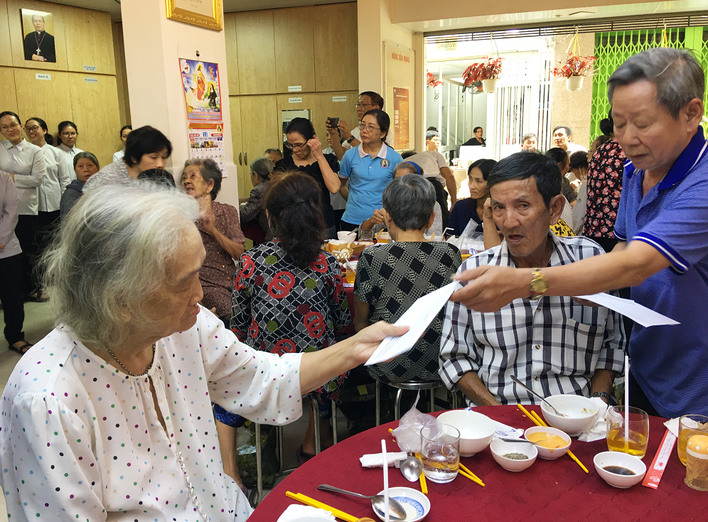 Các nữ tu hiện diện giúp gắp thức ăn cho những người đau yếu, khuyết tật. Sau bữa ăn, mỗi gia đình nhận phần quà và phong bao lì xì từ linh mục chánh xứ và Ban Thường vụ.