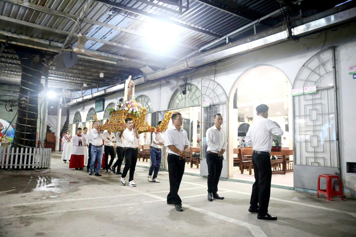 Trước Thánh lễ, cộng đoàn long trọng rước kiệu xung quanh khuôn viên nhà thờ. Đi đầu là Thánh giá nến cao, tiếp đến là ca viên ca đoàn, các bậc trưởng trong giáo xứ, sau cùng là kiệu thánh nữ Têrêsa, linh mục chủ tế và các em lễ sinh.