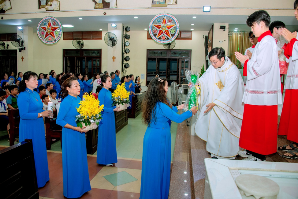 Thánh lễ do linh mục chánh xứ Giuse Hoàng Đình Hải chủ sự, với sự hiện diện của quý tu sĩ nam nữ, Hội đồng Mục vụ Giáo xứ, Hội Gia đình Thánh Mẫu và đông đảo các thành phần Dân Chúa trong giáo xứ.