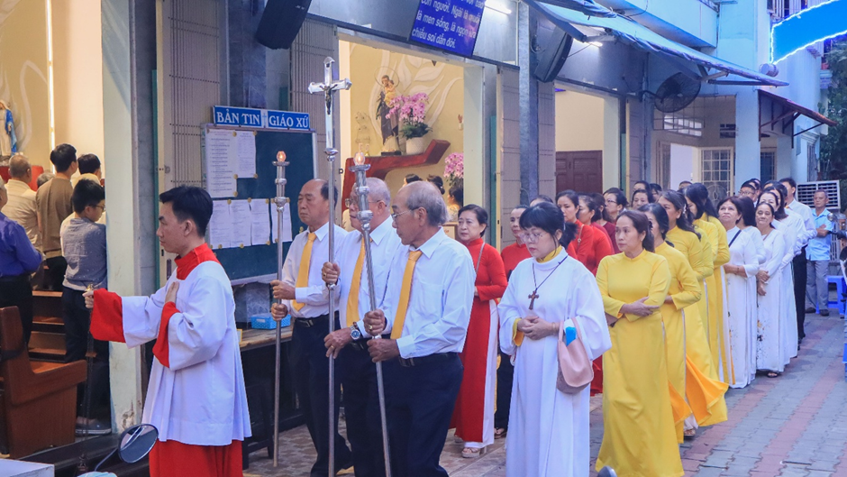Thánh lễ khởi sự với đoàn rước từ sân nhà thờ tiến vào cung thánh.