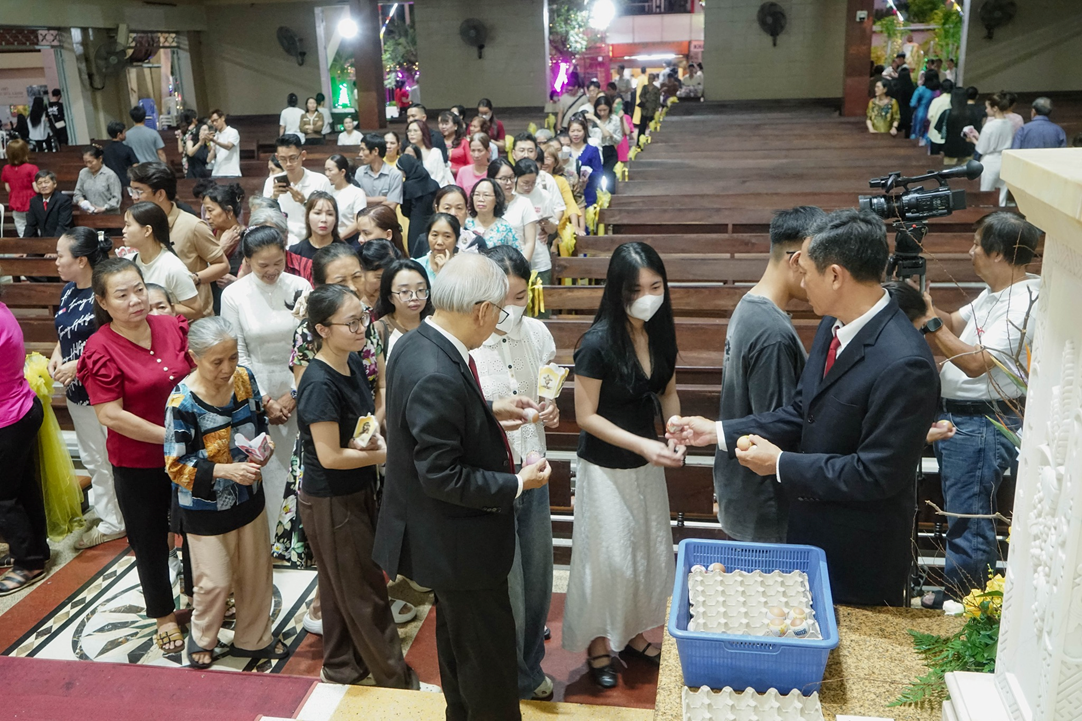 Thánh lễ kết thúc lúc 23g00 trong bầu khí hân hoan. Tiếng hát vang lên diễn tả niềm vui vỡ òa. Trước khi ra về, mỗi người tham dự đều nhận được một quả trứng luộc. Đây không chỉ là món quà nhỏ, mà còn mang ý nghĩa biểu tượng sâu sắc: quả trứng gợi hình ảnh sự sống mới đang tiềm tàng bên trong lớp vỏ, như ngôi mộ đá không thể giam giữ sự sống của Chúa Phục Sinh.