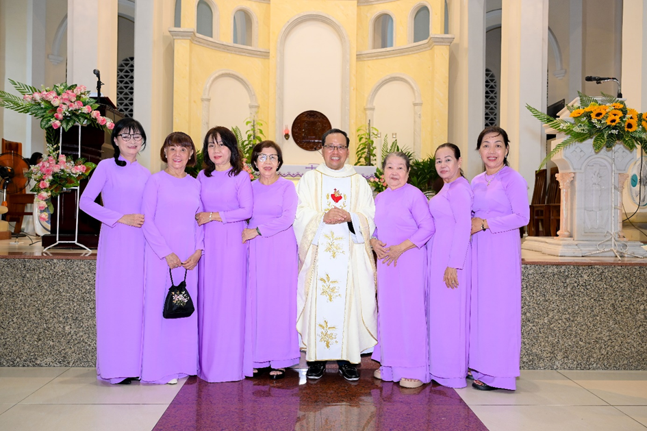 Sau Thánh lễ, tại thềm cung thánh, ca đoàn và đại diện giáo xứ đã chụp hình lưu niệm với linh mục chánh xứ.