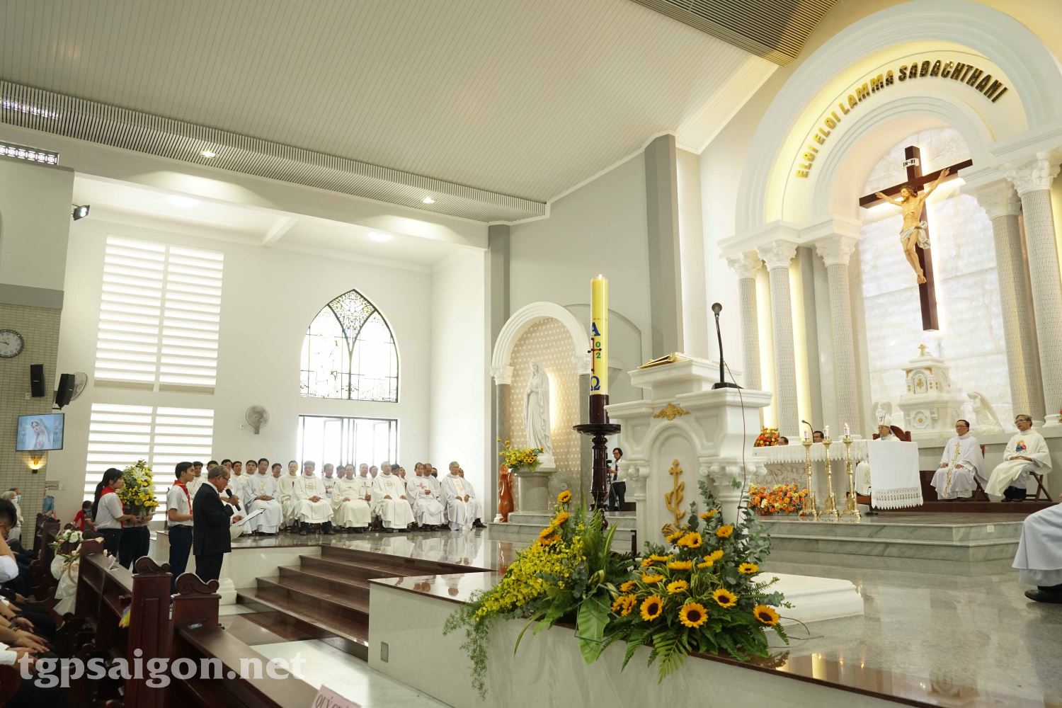 Đồng tế với ngài có linh mục (Lm) Chánh xứ Khiết Tâm Giuse Vũ Hoàng Anh, cùng gần 50 Lm dòng và triều.