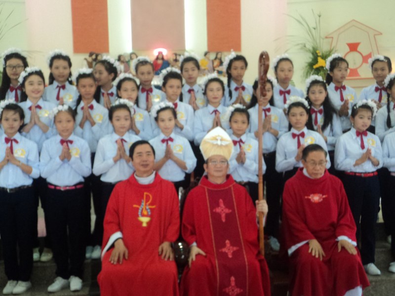 WGPSG -- Vào lúc 8g00 sáng thứ Bảy ngày 19.7.2014, giáo xứ Long Bình, hạt Thủ Thiêm đã hân hoan đón tiếp Đức Tổng Giám mục Phaolô Bùi Văn Đọc, Tổng Giám mục Tổng Giáo phận Sài Gòn, về thăm mục vụ tại giáo xứ và ban bí tích Thêm Sức cho 64 em, 23 em Rước Lễ lần đầu và 14 em Tuyên hứa Bao Đồng.