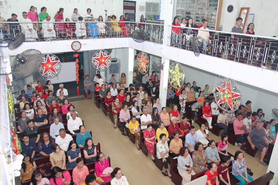 Không khí rộn ràng tiếng cười, lời chúc mừng năm mới vang lên khắp nhà thờ. Mọi người trao nhau những cái bắt tay, nụ cười và lời chúc bình an, thịnh vượng.