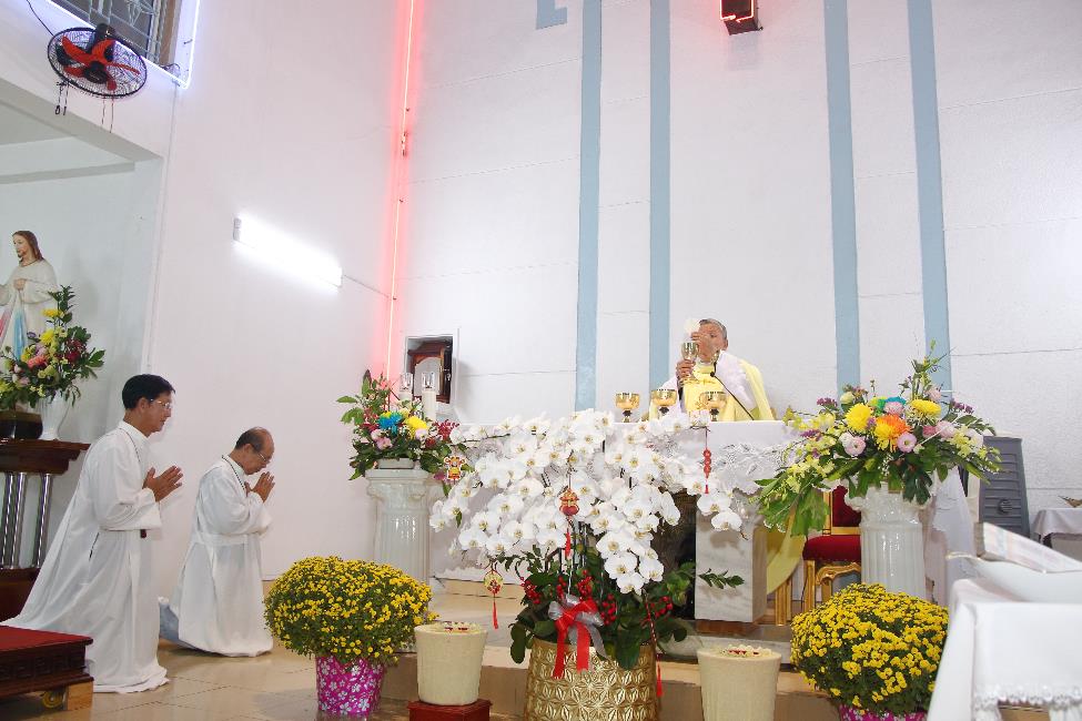 Đúng 21g00, Thánh lễ Giao thừa chính thức bắt đầu do cha sở Giuse Trịnh Thanh Hoàng chủ tế. Cộng đoàn cùng hướng về Chúa trong niềm cảm tạ và hy vọng qua ca khúc nhập lễ “Phút Giao Thừa” (Vũ Mộng Thơ - Nguyễn Duy).