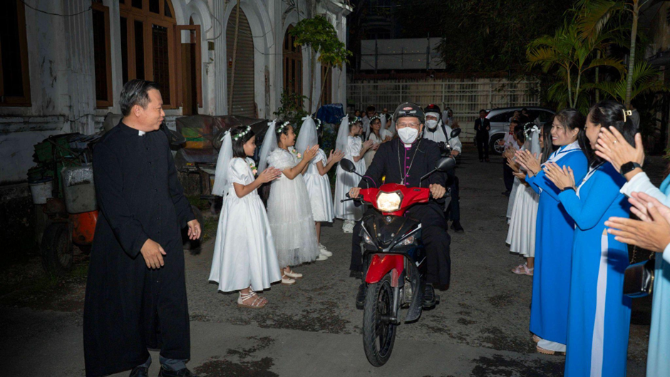 Trước đó, lúc 18g, linh mục chánh xứ Giuse cùng Hội đồng Mục vụ, các đoàn thể và thiếu nhi đã có mặt tại cổng nhà thờ để chào đón Đức Giám mục Giuse và quý cha.
