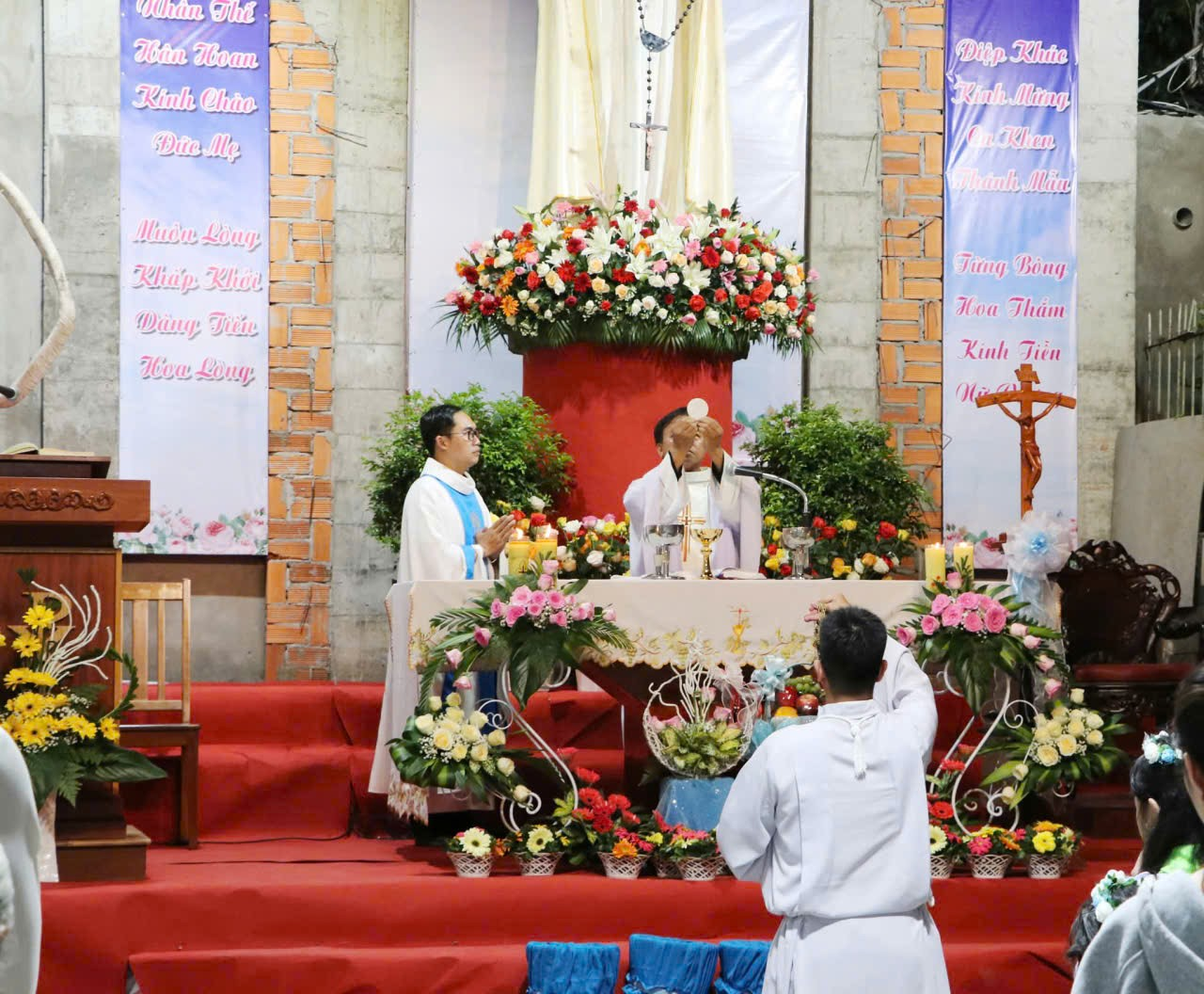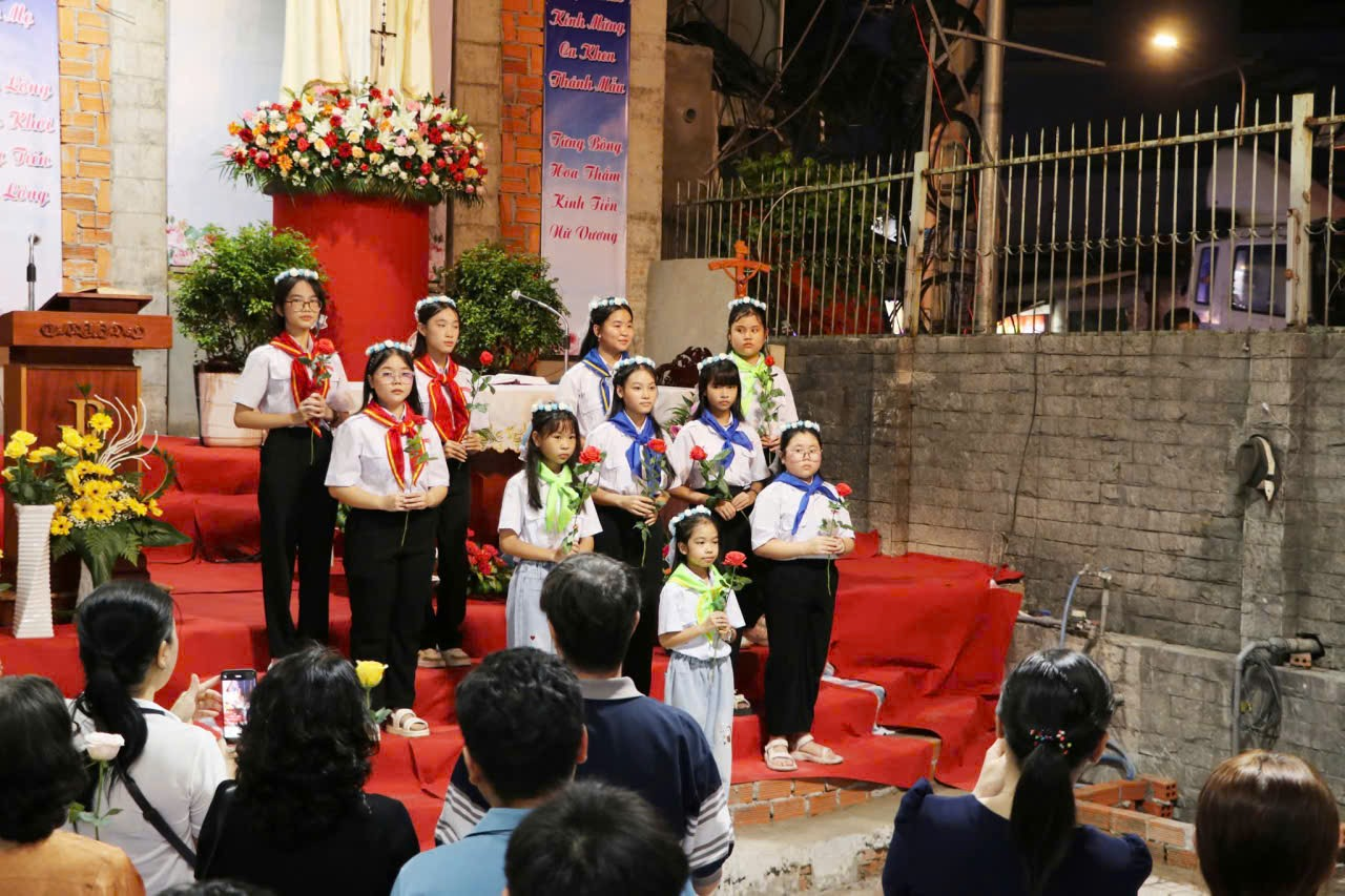 Đầu Thánh lễ, các em thiếu nhi Thánh Thể trong tà áo trắng tinh khôi dâng hoa lên Đức Mẹ, như những đóa hoa lòng thơm ngát, tỏ lòng yêu mến và biết ơn Nữ Vương Rất Thánh Mân Côi. Toàn thể cộng đoàn hòa mình trong điệu múa, cùng dâng lên Mẹ những đóa hoa tươi thắm, gói trọn tâm tình kính mến.