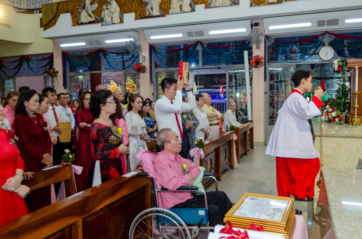 Sau lời nguyện hiệp lễ, linh mục chánh xứ Gioan Baotixita Nguyễn Quang Tuyến đã có lời chúc mừng và cầu chúc hồng ân Thiên Chúa cho các đôi hôn phối mừng kỷ niệm trong Thánh lễ hôm nay. Tiếp đó, ngài trao Bằng Phép lành Tòa Thánh cho 25 đôi hôn phối.