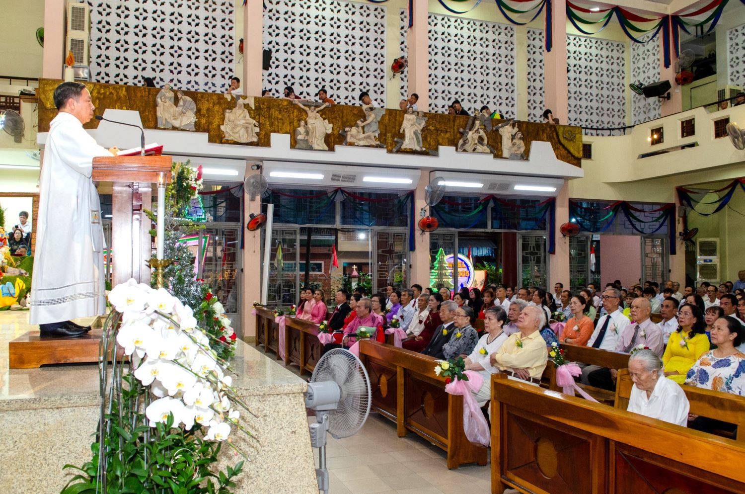 Trong bài giảng lễ, linh mục Gioan Nguyễn Thiên Minh, OP chia sẻ rằng khi nhìn vào các đôi vợ chồng kỷ niệm hôn phối qua nhiều thập niên, điều đẹp nhất không còn nằm ở chiếc áo cưới hay những tấm hình ngày xưa, mà ở chỗ họ vẫn còn hiện diện bên nhau, vẫn đi chung một hành trình và nắm tay nhau, dù đôi tay đã chai sần theo năm tháng. Chính sự hiện diện của các đôi hôn phối trong Thánh lễ là một lời chứng sống động cho tình yêu bền vững, tình yêu được Thiên Chúa chúc phúc khi hai người biết tín thác và gìn giữ nhau.