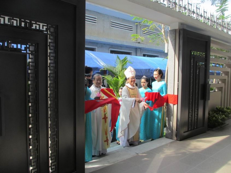 Trước Thánh lễ, quý cha cùng toàn thể cộng đoàn đứng trước ngôi Nhà Sinh hoạt mới xây dựng để tham dự lễ Khánh thành. Nghi thức cắt băng khánh thành do Đức cha phụ tá Phêrô và Cha đặc trách linh mục thực hiện.
