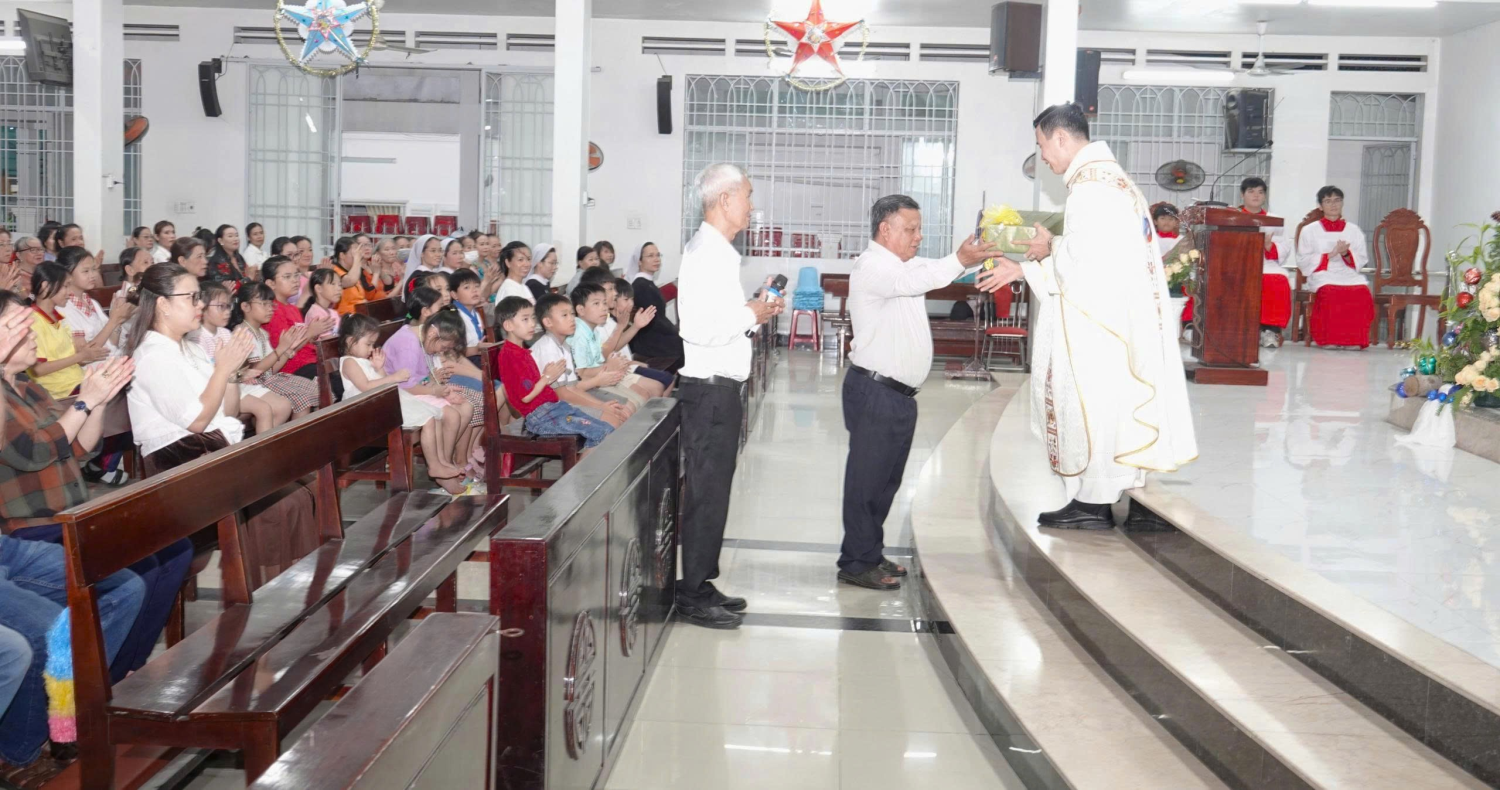 Sau lời nguyện hiệp lễ, ông Chủ tịch Hội đồng Mục vụ giáo xứ, đại diện cộng đoàn, đã có lời chúc mừng và tri ân tân linh mục Phêrô Nguyễn Thái Sơn, MSV, đồng thời trao tặng ngài món quà lưu niệm của giáo xứ.