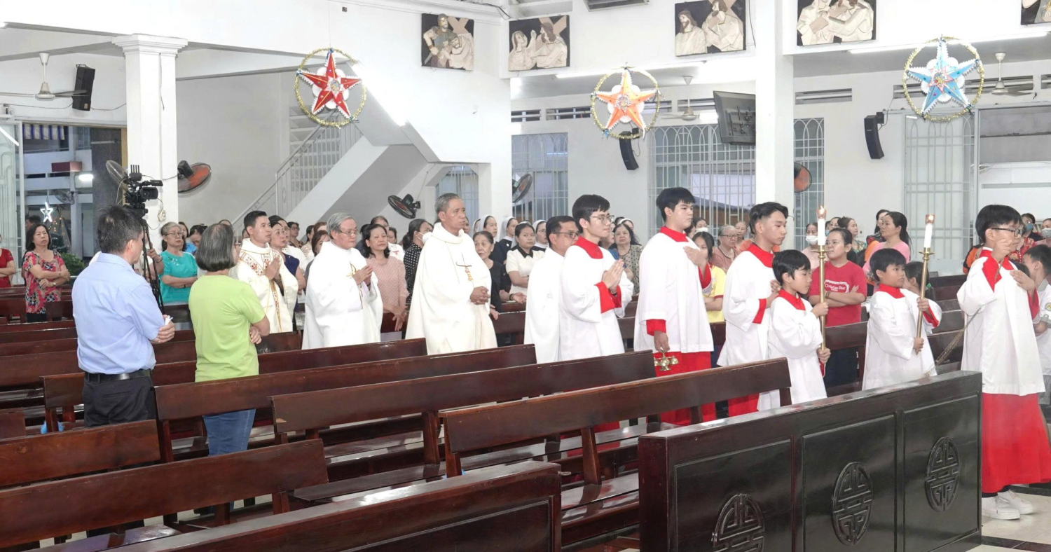 Thánh lễ khởi sự với đoàn rước từ cuối nhà thờ tiến lên cung thánh.