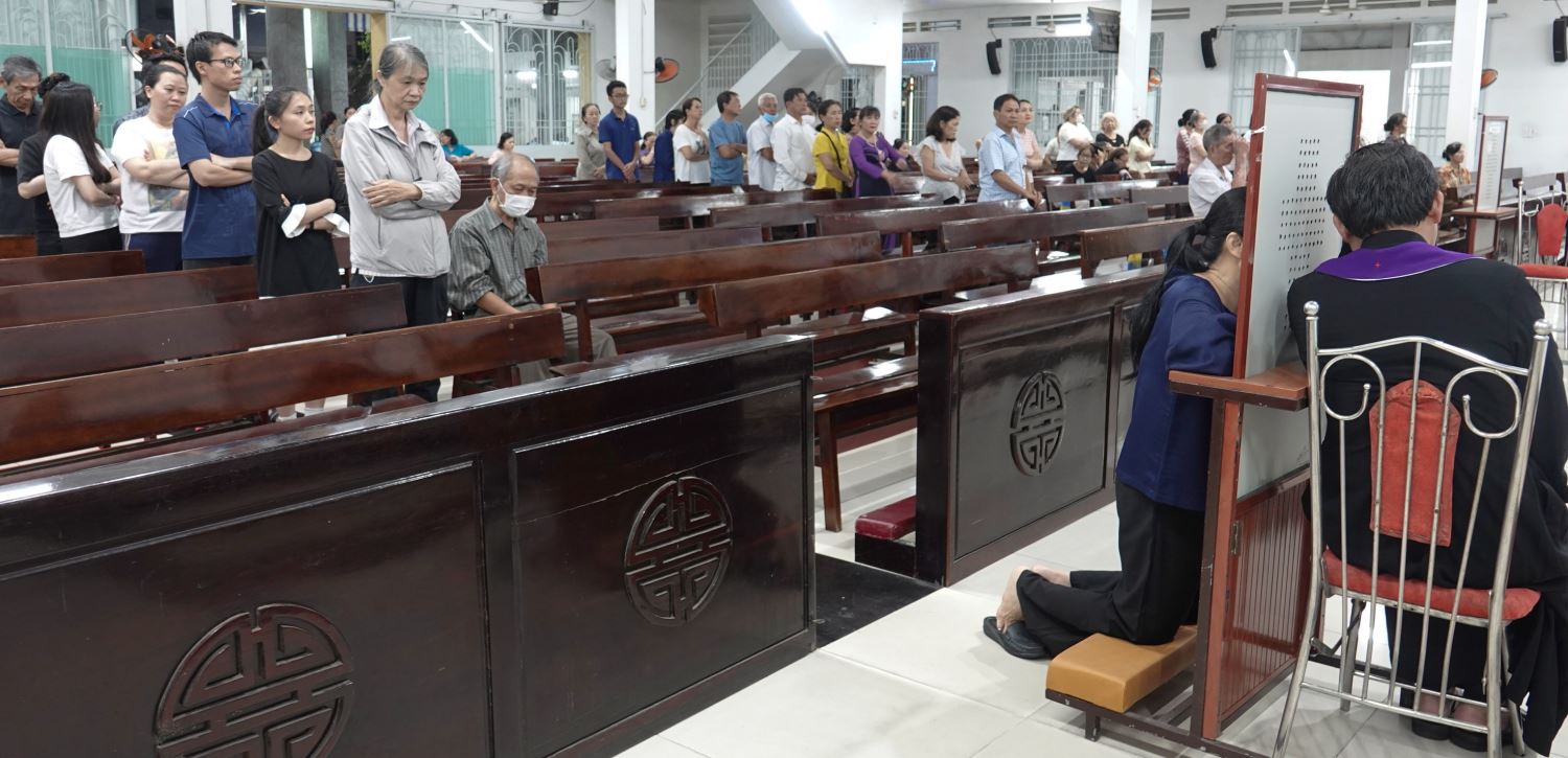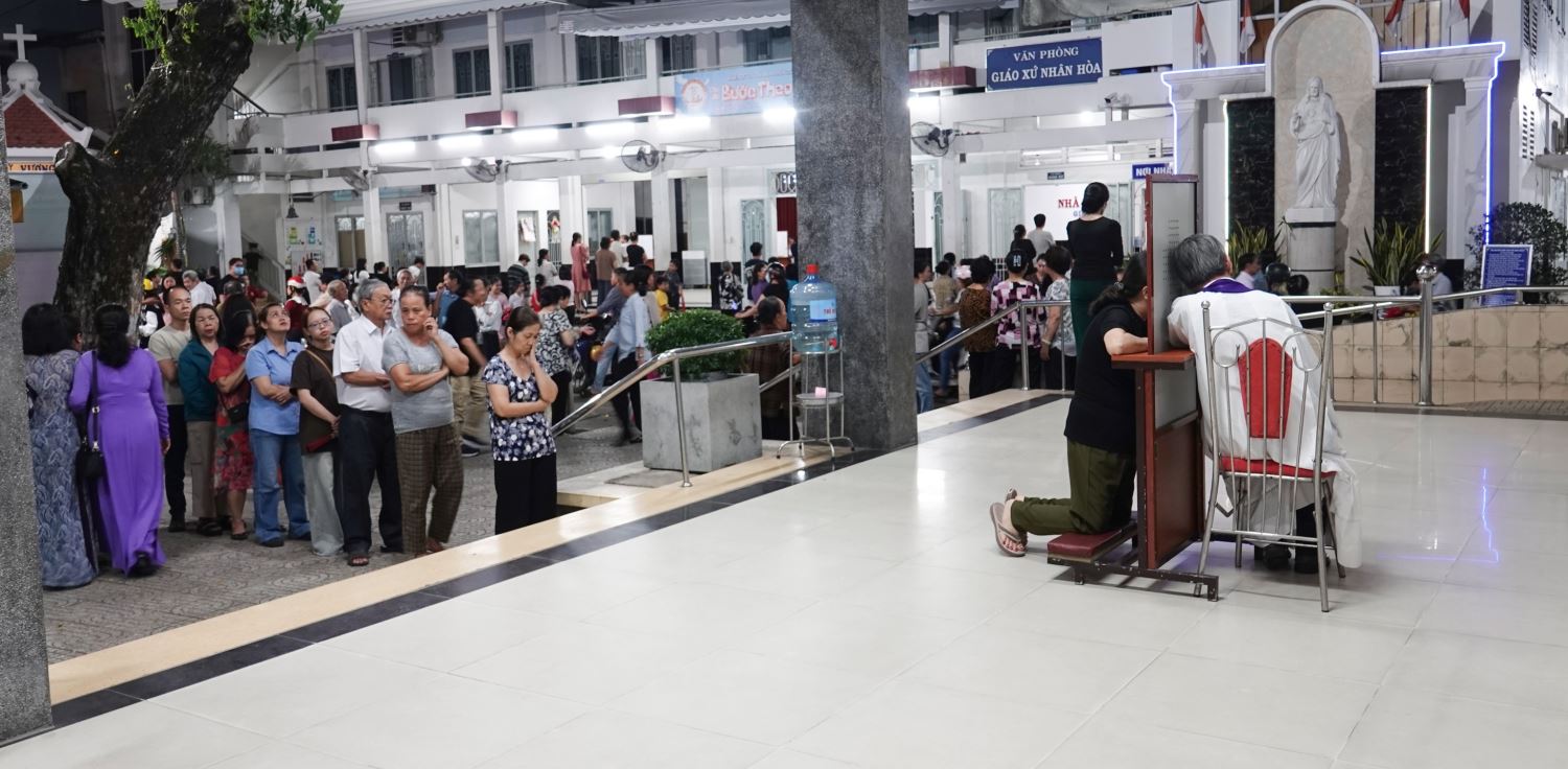 Sau Thánh lễ, bầu khí tĩnh tâm tiếp tục được nối dài qua Bí tích Hòa Giải. Hình ảnh nhiều linh mục ngồi tòa giải tội cùng đông đảo giáo dân kiên nhẫn xếp hàng lãnh nhận Bí tích Hòa Giải cho thấy lòng khao khát trở về với Chúa của cộng đoàn.