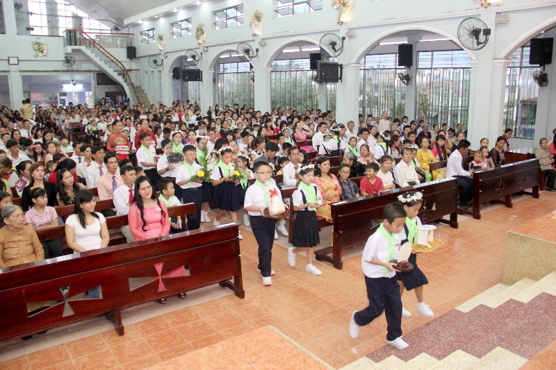 WGPSG -- Hằng năm, vào dịp Lễ kính Mình Máu Chúa Giêsu, giáo xứ Nữ Vương Hoà Bình, hạt Xóm Mới, thường tổ chức cho các em Rước Lễ lần đầu. Vì thế, vào lúc 17g00, thứ Bảy ngày 21.6.2014, cha xứ và quý phụ huynh cùng 63 em Rước Lễ lần đầu, đã tiến vào thánh đường dâng Thánh lễ trọng thể.