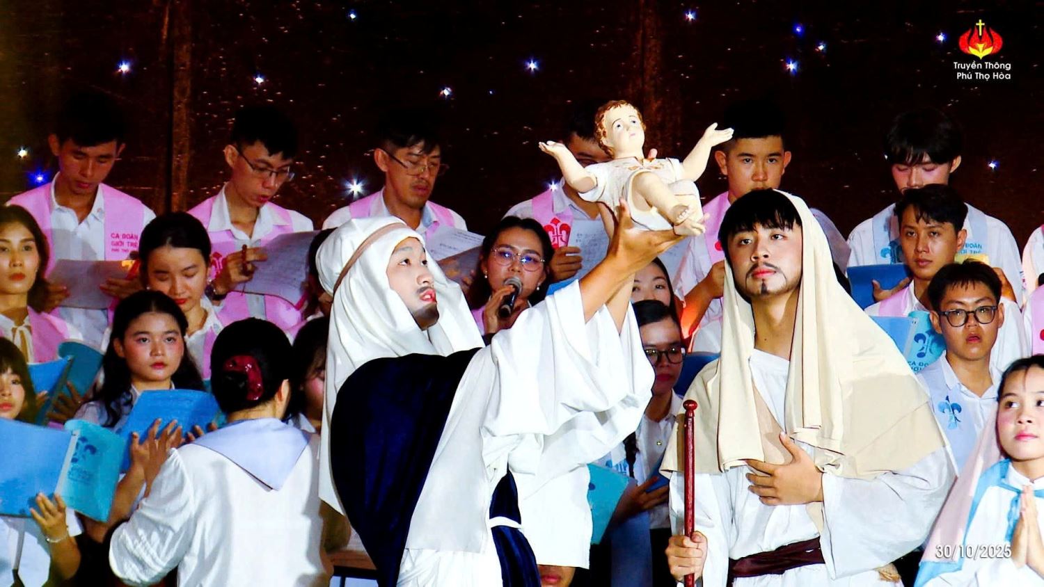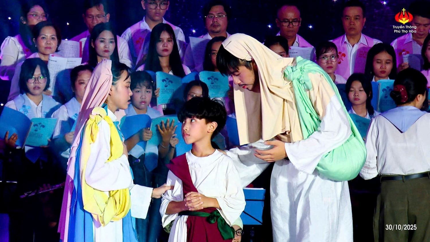 TGPSG -- Sau 4 tuần thực hiện đọc kinh Mân Côi kính Đức Mẹ vào thứ Bảy hàng tuần tại đài Đức Mẹ, lúc 19g đến 20g30 thứ Năm ngày 30-10-2025, kết thúc tháng Mân côi, Ban điều hành Giới trẻ và đoàn Thiếu nhi Thánh Thể của giáo xứ Phú Thọ Hòa đã kết hợp để tổ chức một buổi Diễn nguyện Thánh ca.