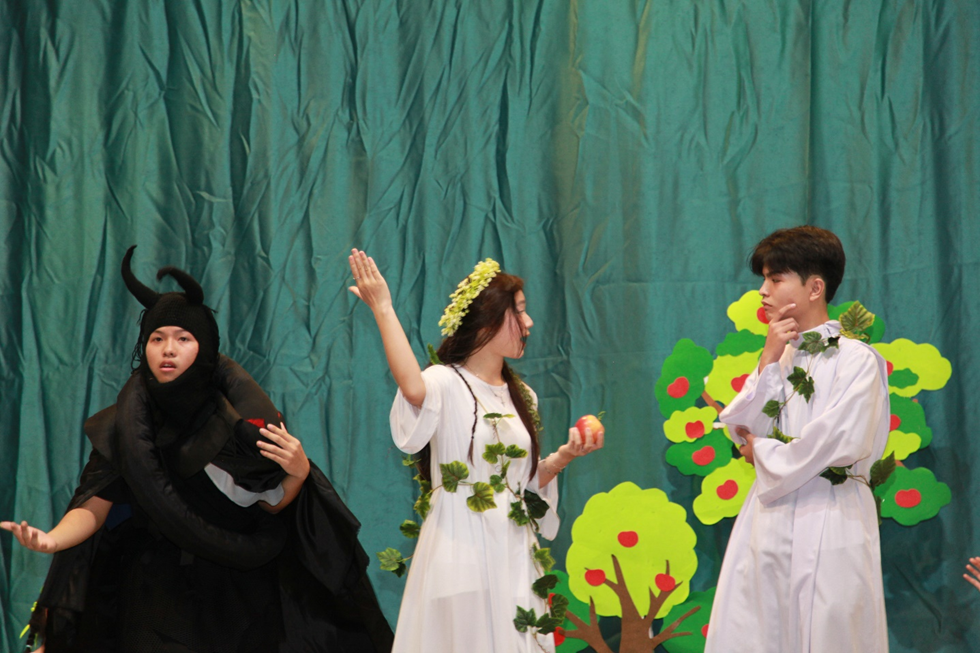 Ở phần đầu là cảnh Thiên Chúa tạo dựng: từ hư vô và tối tăm, Thiên Chúa phân ranh sáng – tối, dựng nên vũ trụ, đất trời, muôn loài và cuối cùng là con người, tạo vật cao trọng nhất, được dựng nên theo hình ảnh Thiên Chúa. Những động tác múa và bài hát mở đầu khắc họa vẻ đẹp hài hòa của công trình tạo dựng, làm nổi bật tình yêu và quyền năng của Đấng Tạo Hóa. Niềm vui ấy nhanh chóng chuyển sang gam màu đau thương khi con người vì nghe lời dụ dỗ mà sa ngã, đánh mất ân nghĩa với Thiên Chúa. Kết cảnh bằng hiệu ứng âm thanh, ánh sáng, khói tạo điểm nhấn mạnh mẽ, diễn tả hậu quả nặng nề của tội lỗi.